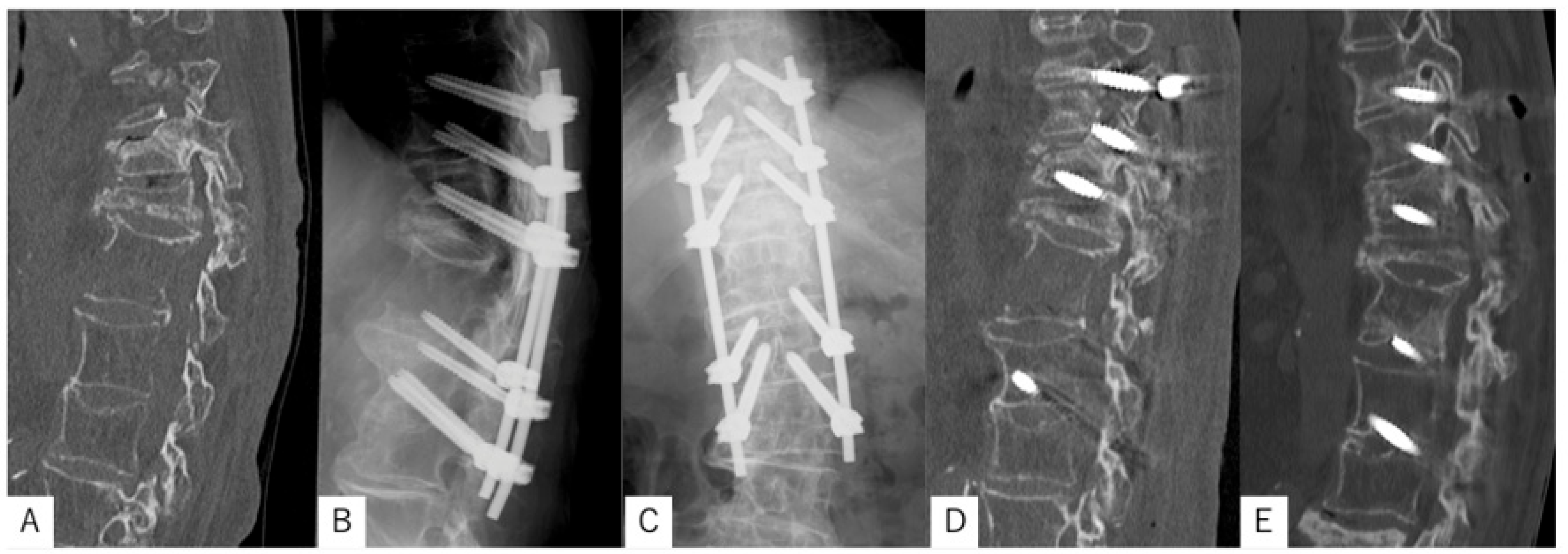 - Buxbaum, R.E.; Shani, A.; Mulla, H.; Rod, A.; Rahamimov, N. Percutaneous, PMMA-augmented, pedicle screw instrumentation of thoracolumbar ankylotic spine fractures. J. Orthop. Surg. Res. 2021, 16, 317. [Google Scholar] [CrossRef] [PubMed]