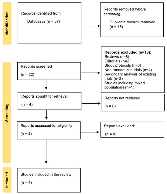 A total of 37 records were identified through database searching. After removing 15 duplicates, 22 records were screened based on title and abstract. Of these, 18 full-text articles were excluded for failing to meet the eligibility criteria, leaving four studies that met all inclusion criteria. Therefore, four RCTs met the inclusion criteria and were included in the final analysis [30,31,32,33]. The PRISMA 2020 flow diagram (Figure 1) illustrates the selection process. A detailed list of excluded studies, along with the reasons for exclusion, is provided in Supplementary Table S1.