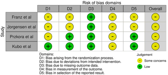 Risk of bias assessment using the revised Cochrane Risk of Bias tool (RoB 2) [30,31,32,33].