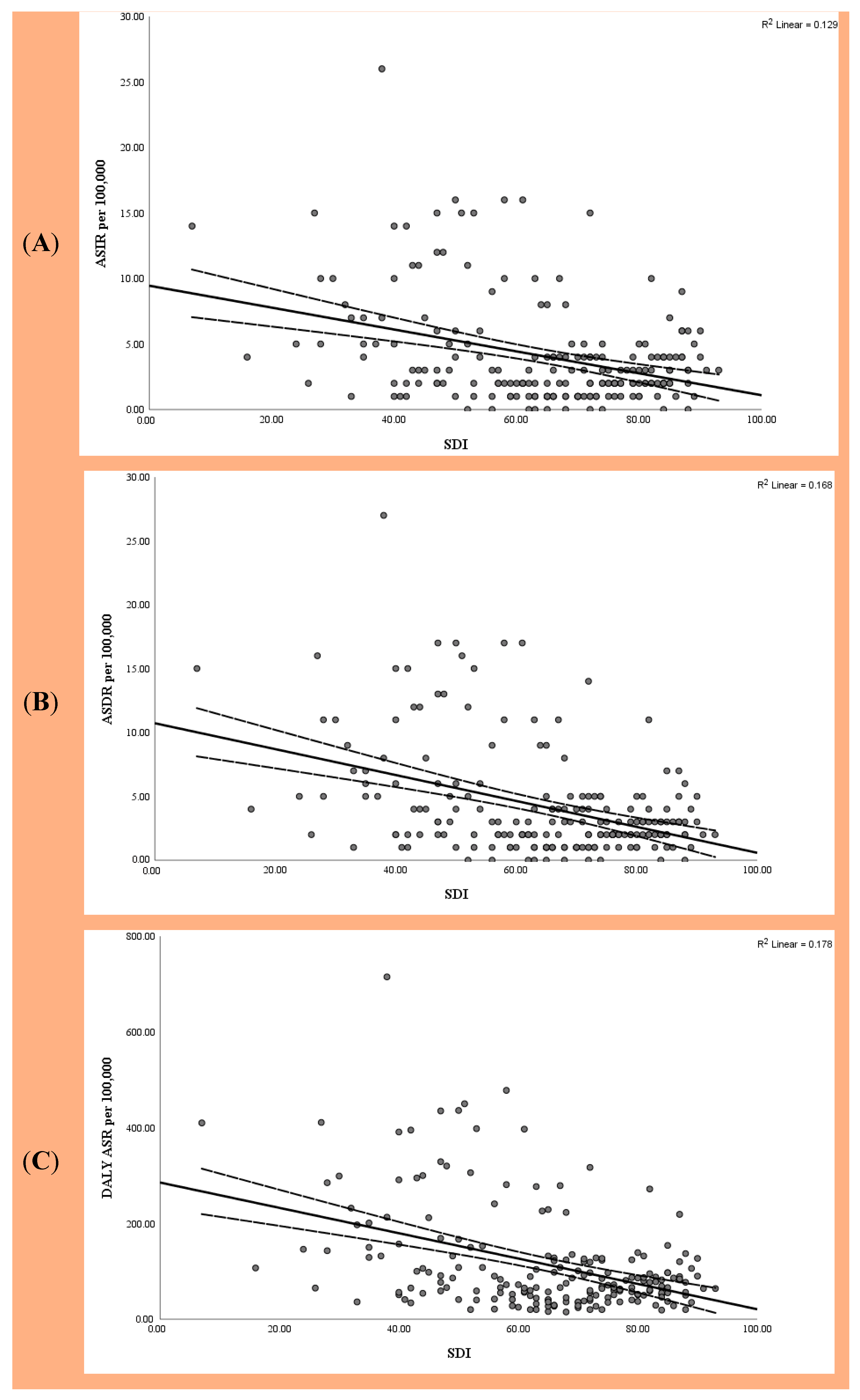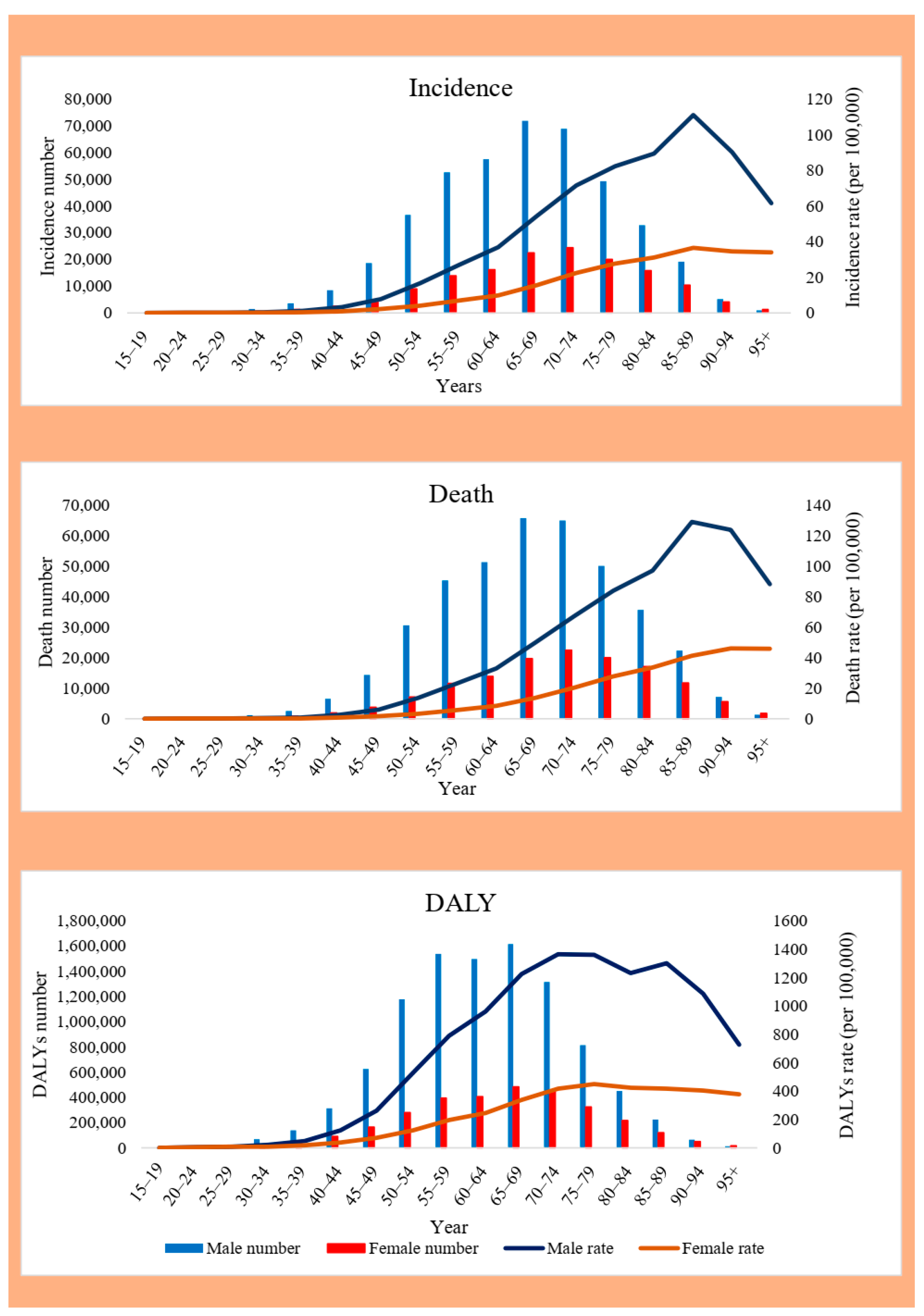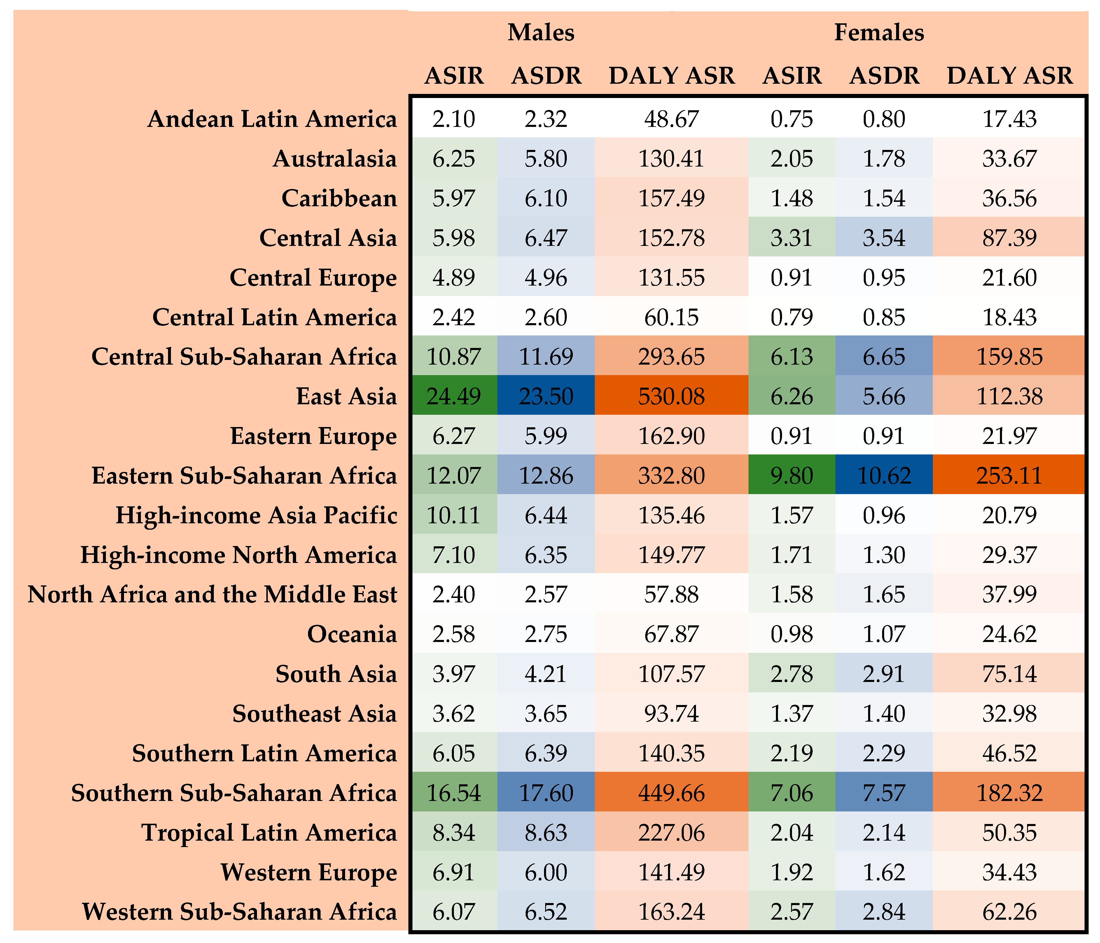 | Characteristics | Incidence Cases (95% UI) | ASIR per 105 (95% UI) | Death Cases (95% UI) | ASDR per 105 (95% UI) | DALY Number (95% UI) | DALY ASR per 105 (95% UI) |