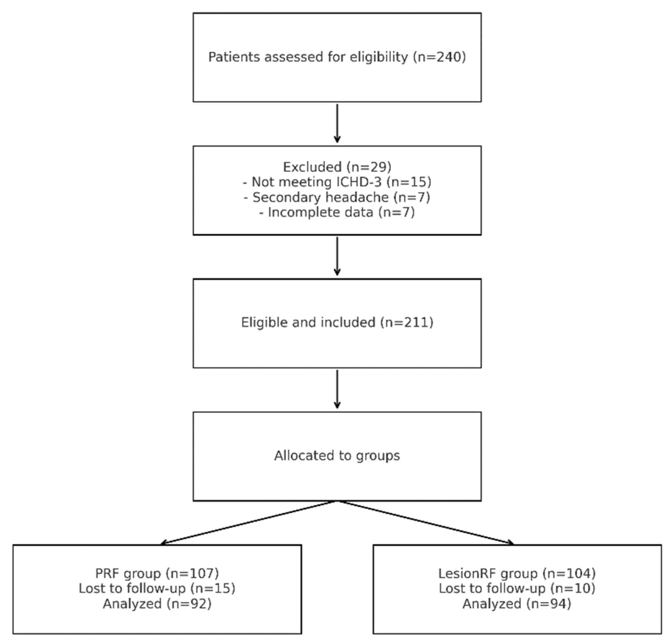 A total of 211 patients were included (PRF = 107; LesionRF = 104). Baseline characteristics, including age, sex, migraine duration, body mass index (BMI), and comorbidity profiles, were balanced between groups (