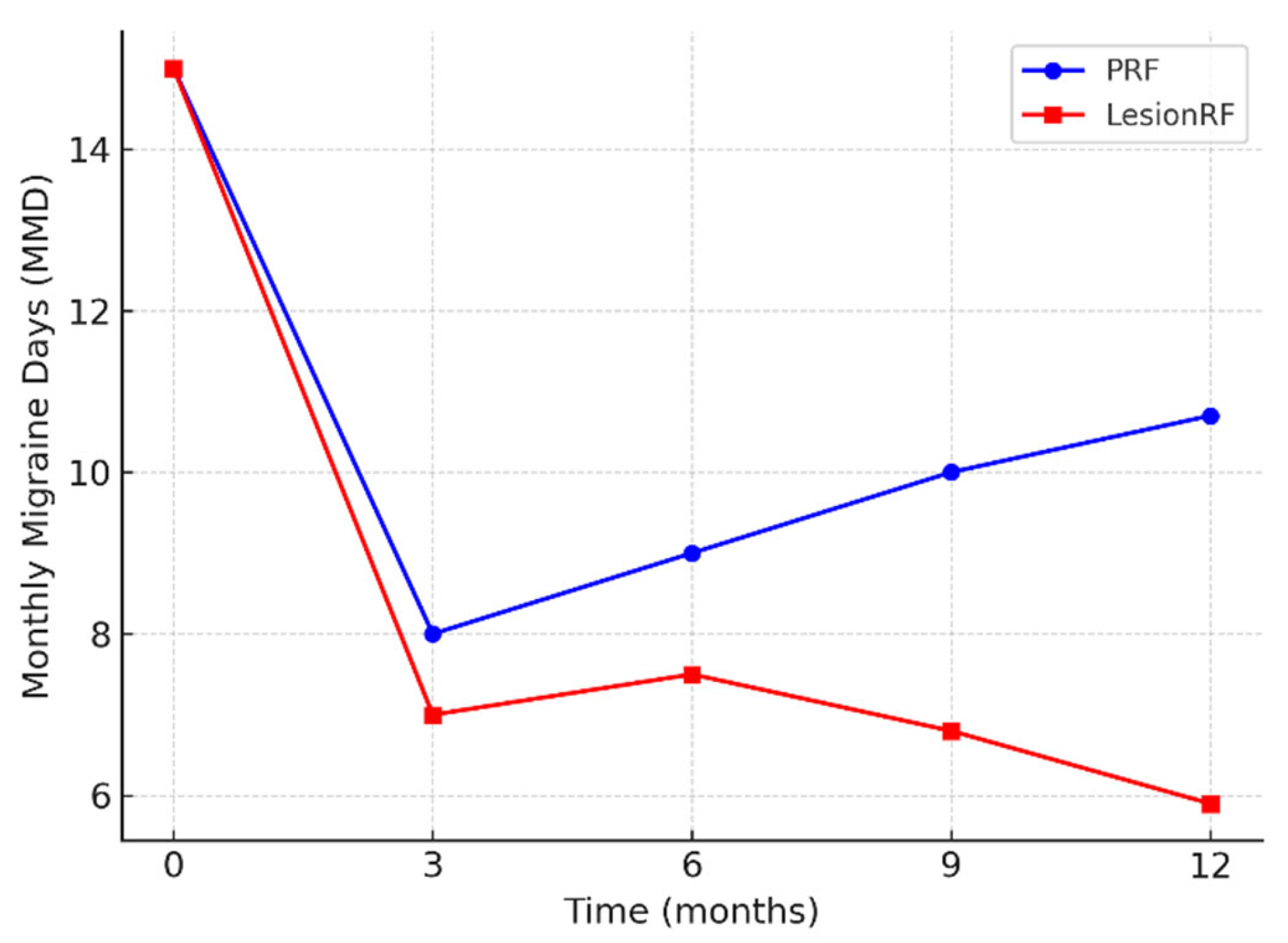 Monthly migraine days (MMD) decreased significantly in both groups; however, the reduction was more pronounced in the LesionRF group at 9 and 12 months. At 12 months, mean MMD was 10.7 ± 3.1 days in the PRF group and 5.9 ± 2.8 days in the LesionRF group. The between-group difference was −4.8 days (95% CI: −5.9 to −3.7;