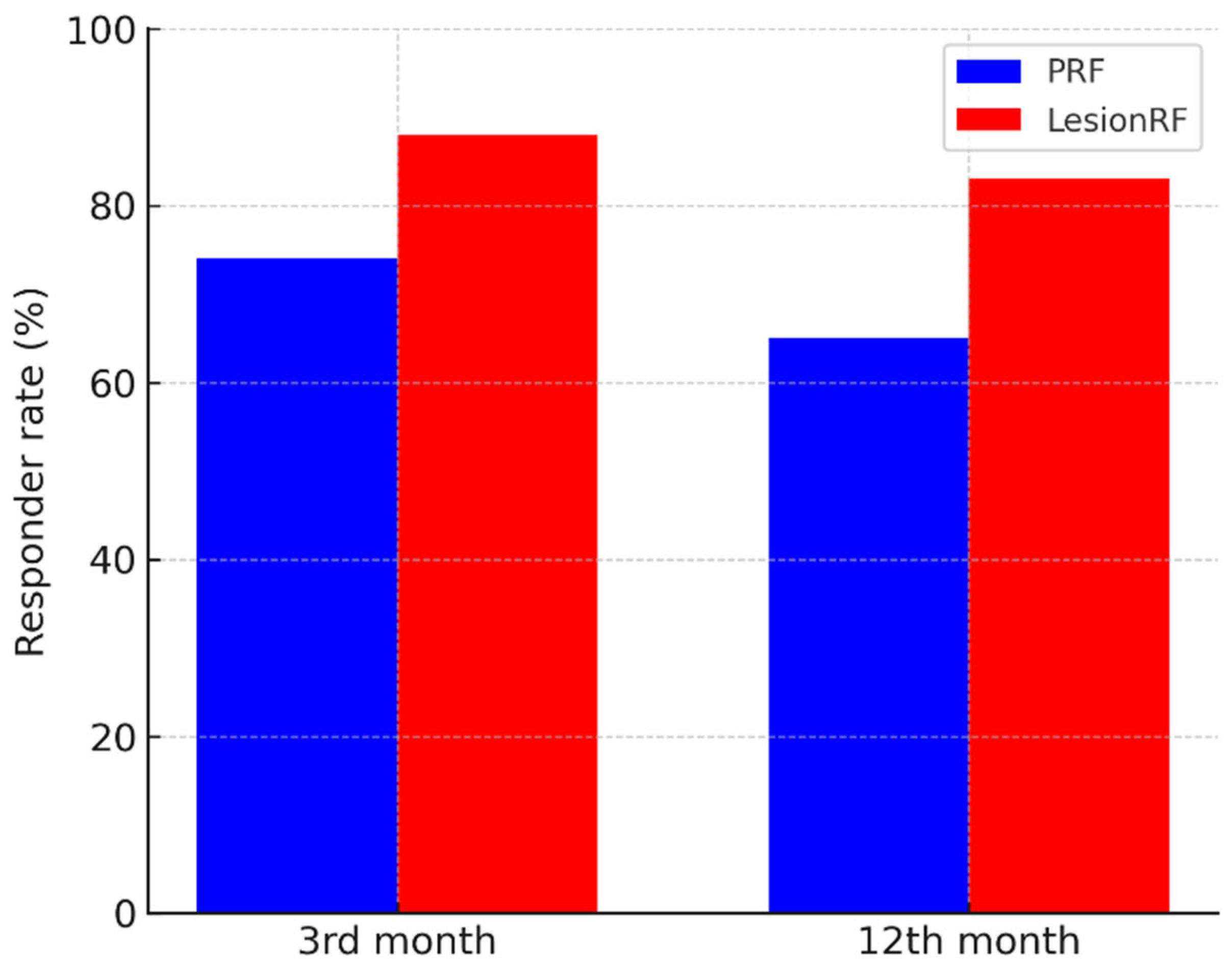 p < 0.001, LMM analysis). The responder analysis (≥50% reduction in MMD) demonstrated a similar advantage for LesionRF: at 3 months, responder rates were 74% (95% CI: 65–82) for PRF and 88% (81–94) for LesionRF (