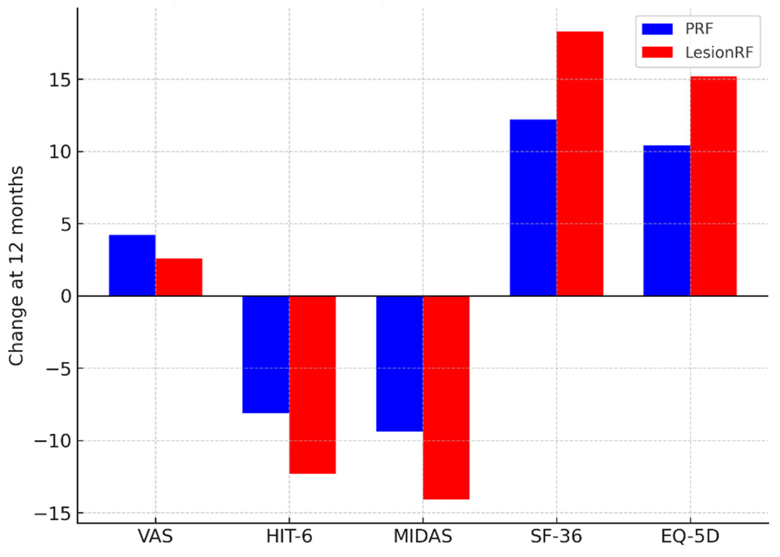 p < 0.001). Functional and quality-of-life measures showed a similar pattern. At 12 months, HIT-6 scores decreased by −8.1 in the PRF group versus −12.3 in the LesionRF group (