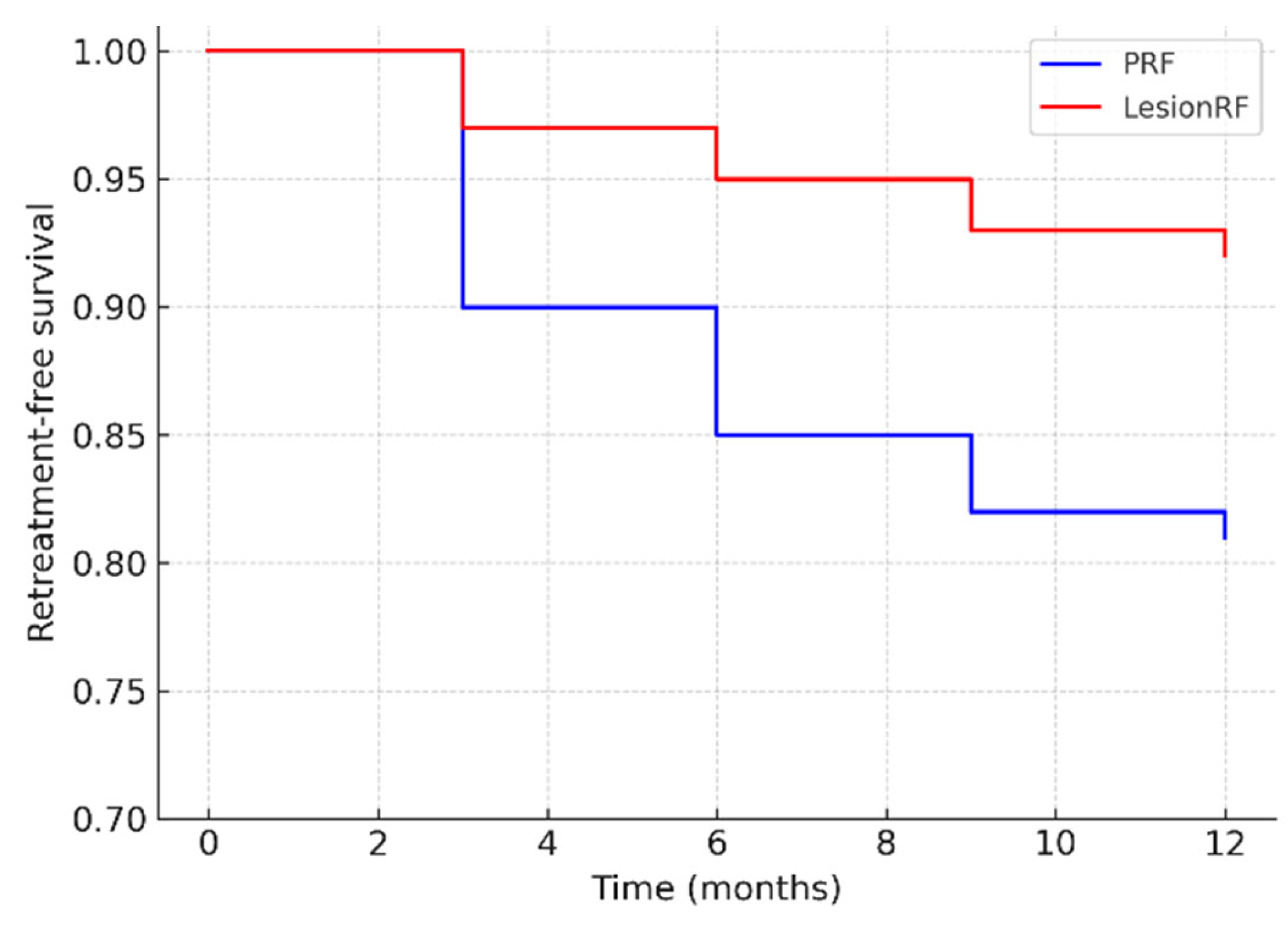 In the PRF group, the rate was 12–27%, whereas in the LesionRF group, it was 8% (95% CI: 3–14). Kaplan–Meier analysis demonstrated a significantly higher risk of retreatment in the PRF group (log-rank