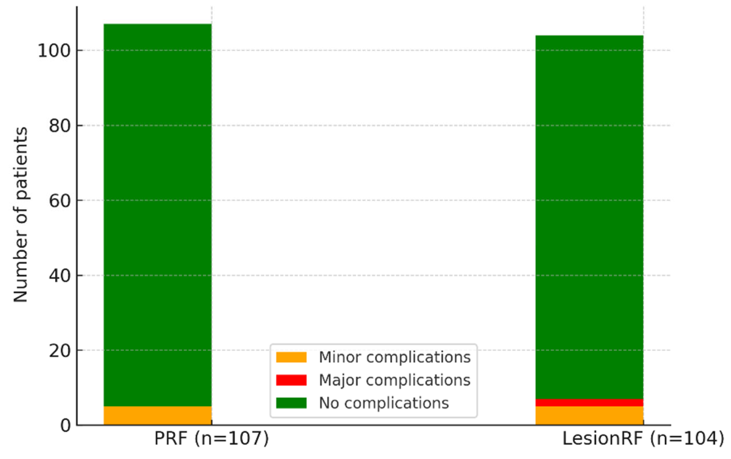 All complications were systematically assessed during the first week and at 1 month; no delayed complications were reported thereafter. Two major complications (hematomas) were observed in the LesionRF group; both resolved completely with conservative management within approximately four weeks, leaving no sequelae. No neurological deficits, sensory loss, or infections were identified. Minor adverse events such as injection-site pain and transient dizziness occurred in approximately 5% of patients. Complications rarely reported in the literature, including transient hypoesthesia or paresthesia, were not observed.