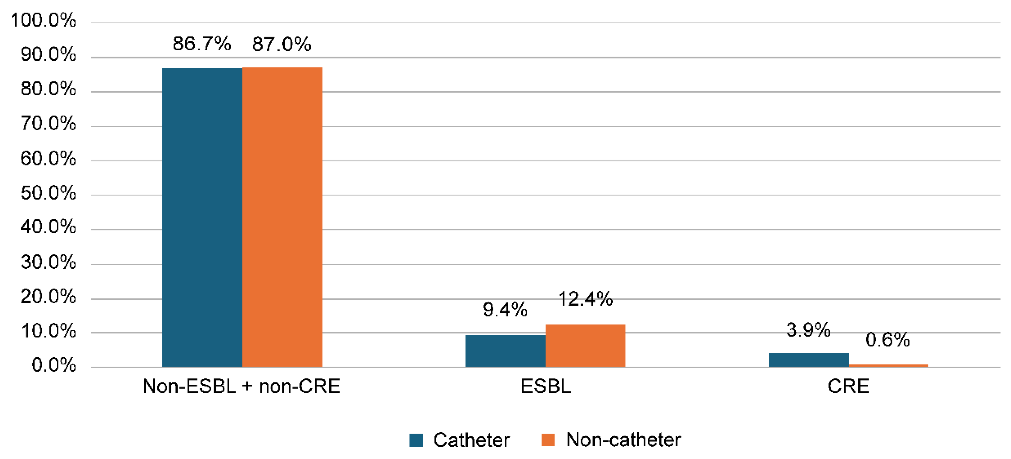 The main aim of this study was to analyze the prevalence and trends of ESBL-producing Enterobacterales and CRE in UTIs in urine samples among catheterized (CAUTI) and non-catheterized (non-CAUTI) patients. Specifically, we sought to (1) determine the prevalence of ESBL-producing Enterobacterales and CRE among patients with Enterobacterales cultures, with a focus on differences between catheterized and non-catheterized individuals, (2) identify the predominant bacterial species associated with ESBL-producing Enterobacterales and CRE, as well as the distribution of resistance genes involved, and (3) explore patient characteristics (demographic, clinical, laboratory, and catheter use) as potential risk factors for the occurrence of ESBL-producing Enterobacterales and CRE in the study population.