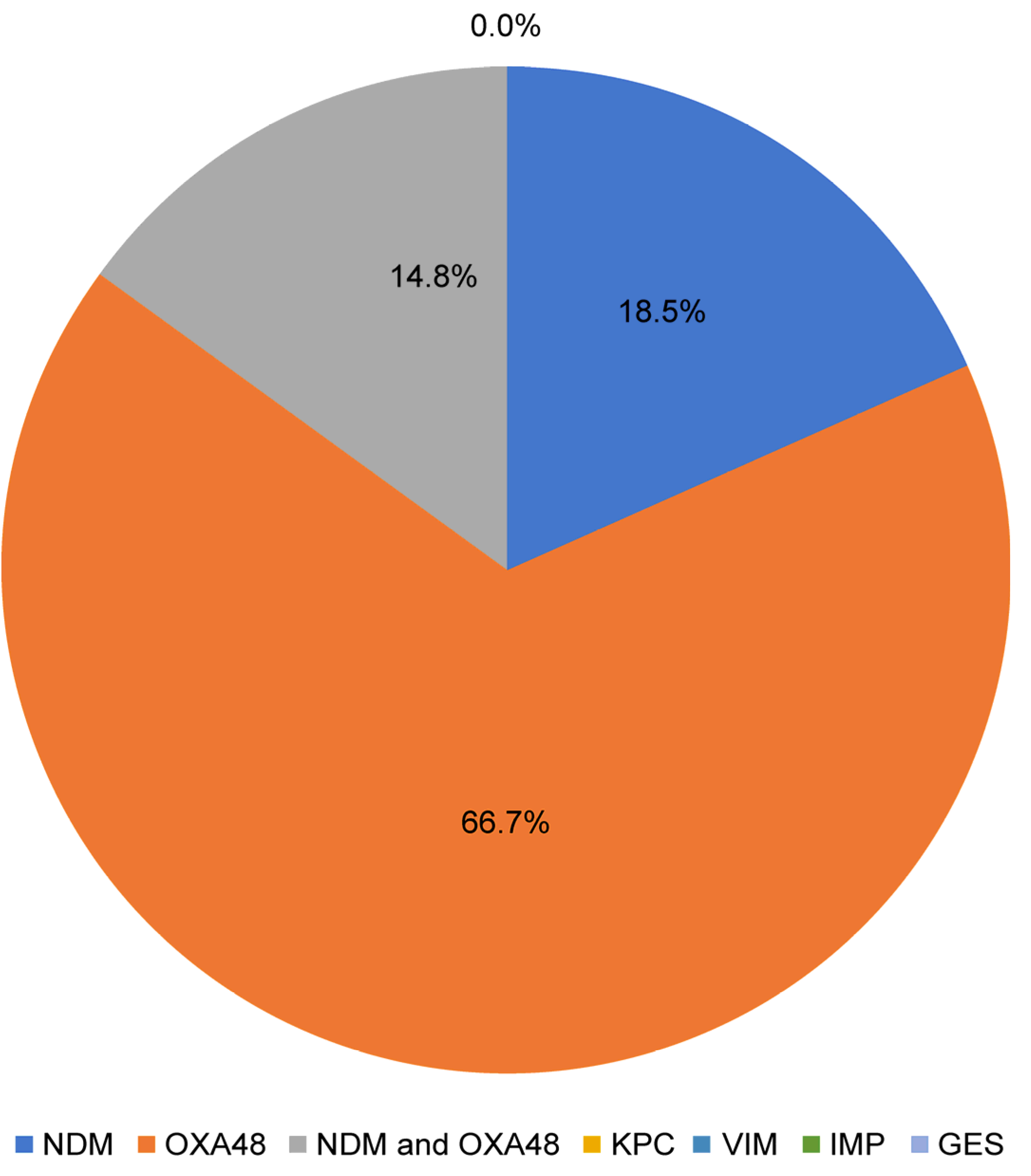 Additionally, isolates resistant to at least one carbapenem were subjected to molecular testing using the Xpert® Carba-R assay (Cepheid, Sunnyvale, CA, USA) for rapid detection and differentiation of the bla-KPC, bla-NDM, bla-VIM, bla-IMP, and bla-OXA-48 gene families.