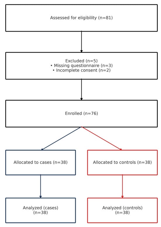 Between May and June 2022, 81 infant records were screened; 3 were excluded for missing questionnaire data and 2 for incomplete consent, yielding 76 participants (38 cases with infC; 38 controls) (Figure 1). Matching was 1:1 (case–control).