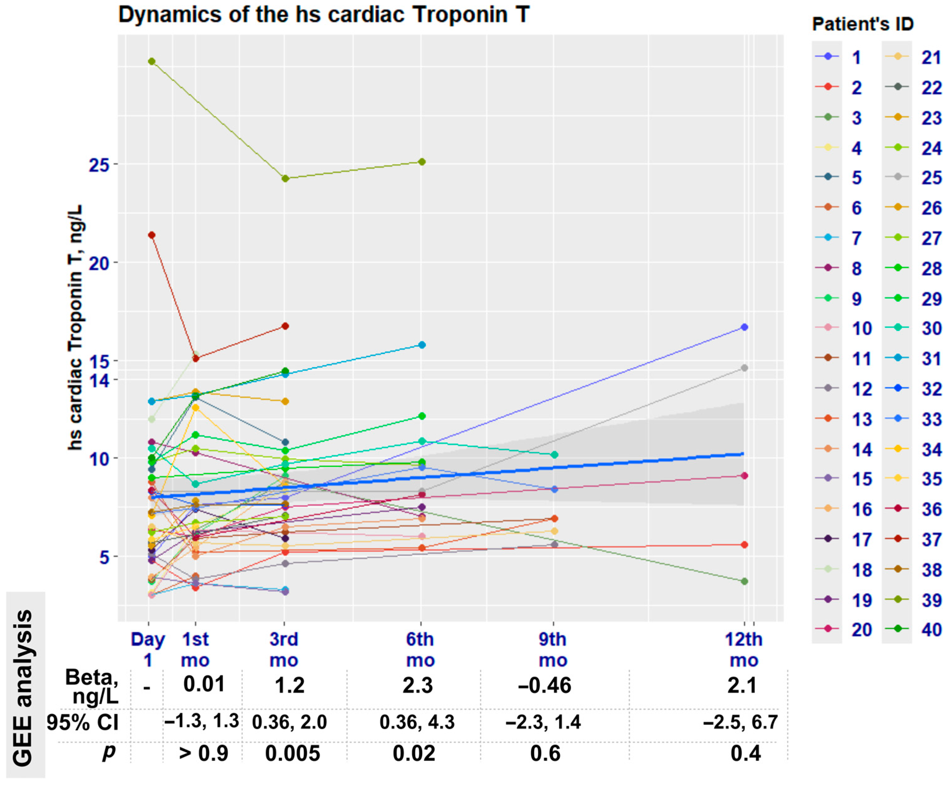 | hs-cTnT | Baseline n = 40 | 1st Month n = 37 | 3rd Month n = 29 | 6th Month n = 14 | 9th Month n = 6 | 12th Month n = 5 |