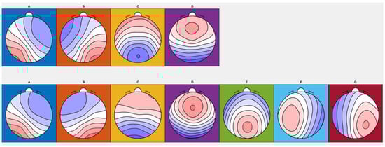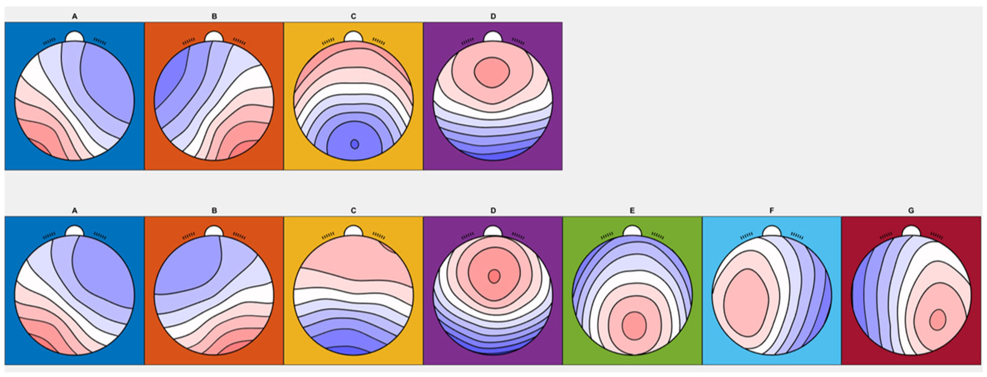 EEG grand mean microstate maps of subjects. For four-class clustering solutions, microstates (A–D) were identified in the first line, while microstates (A–G) were identified for seven-class clustering solutions in the second line.