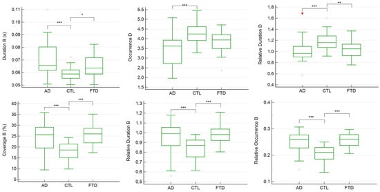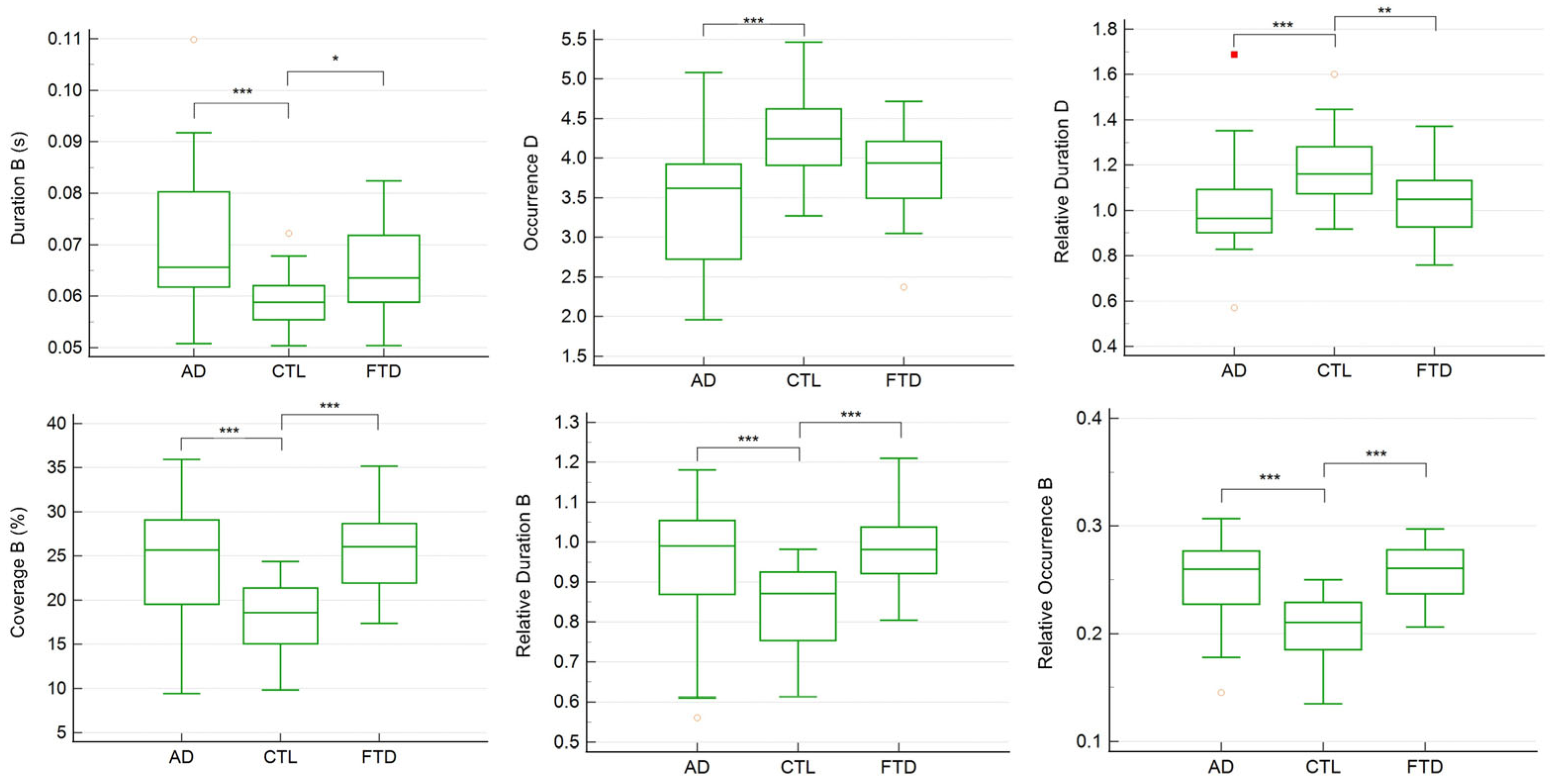 Individual comparisons of each significant temporal parameter across CTL, FTD, and AD groups in 4-class microstates. In the box-and-whisker plot, yellow hollow dots represent outside values (smaller than lower quartile minus 1.5 times the interquartile range or larger than the upper quartile plus 1.5 times the interquartile range (inner fences)). Red rectangles represent far-out values (smaller than the lower quartile minus 3 times the interquartile range, or larger than the upper quartile plus 3 times the interquartile range (outer fences)). The three asterisks represent p value < 0.001; two asterisks represent p value < 0.01; one asterisk represents p value < 0.05.