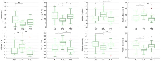In particular, the duration of microstate G was significantly longer in the AD group compared to that in the CTL group (p < 0.001). Moreover, the coverage, occurrence, relative duration, and relative occurrence of microstate C were significantly higher in the CTL group compared to that in the AD and FTD groups, while the coverage, relative duration, and relative occurrence of microstate G were all significantly lower in the CTL group compared to the AD and FTD groups (p < 0.001) (Figure 3).