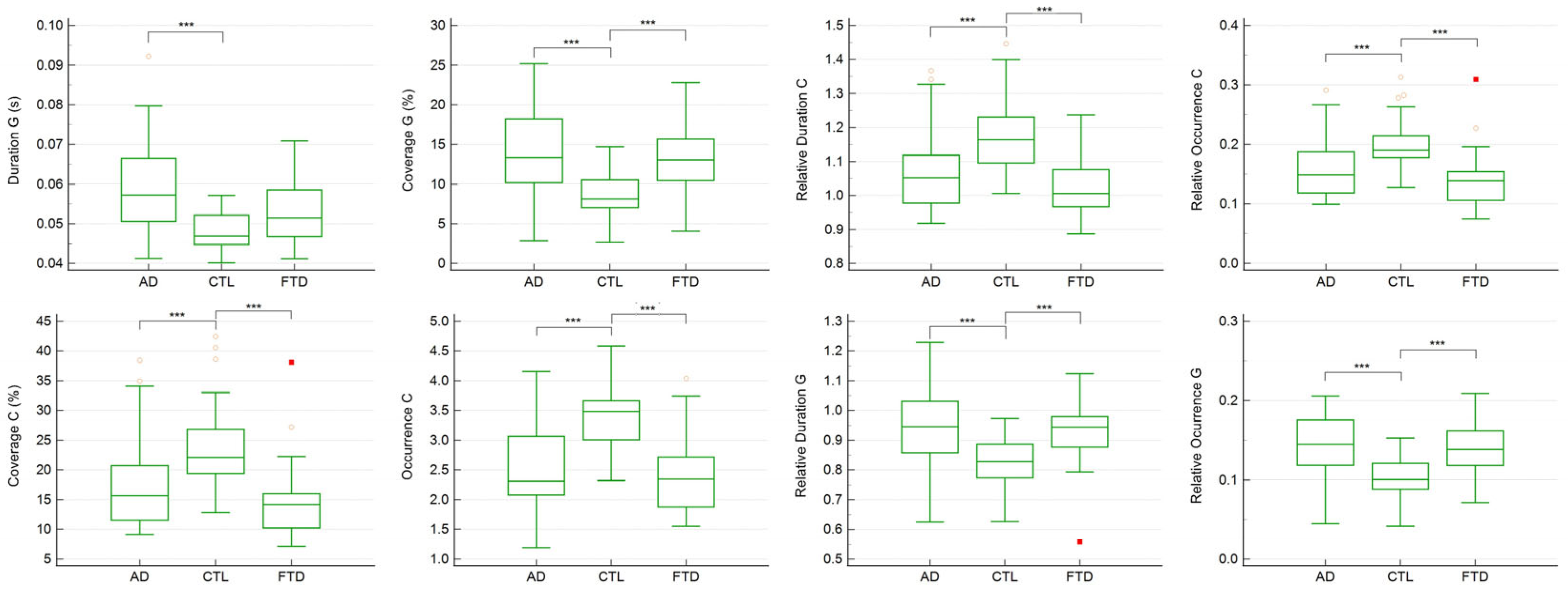Individual comparisons of each significant temporal parameter across CTL, FTD, and AD groups in 7-class microstates. In the box-and-whisker plot, yellow hollow dots represent outside values (smaller than lower quartile minus 1.5 times the interquartile range or larger than the upper quartile plus 1.5 times the interquartile range (inner fences)). Red rectangles represent far-out values (smaller than the lower quartile minus 3 times the interquartile range, or larger than the upper quartile plus 3 times the interquartile range (outer fences)). Three asterisks represent p value <0.001.