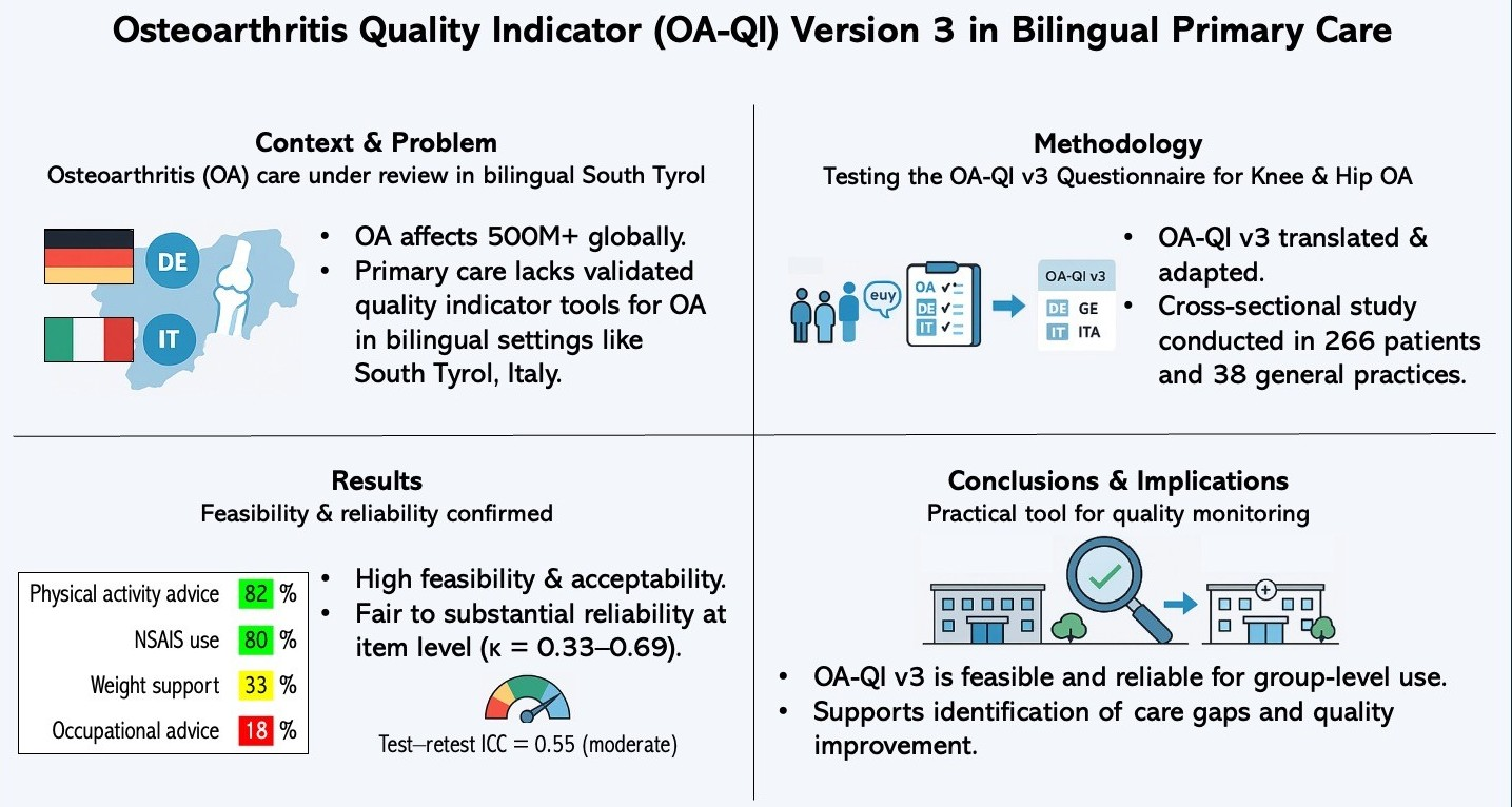 Despite significant international advancements in the development of OA quality indicators, there is a deficiency in validated, regionally adapted instruments for South Tyrol and Italy. The bilingual (i.e., German and Italian) healthcare context of the region has constrained the capacity of general practice networks to systematically measure quality and to benchmark outcomes. The current initiative addresses this issue by translating the OA-QI questionnaire into German and Italian for application within South Tyrol’s healthcare setting, thereby facilitating standardized patient-reported assessments of OA care [