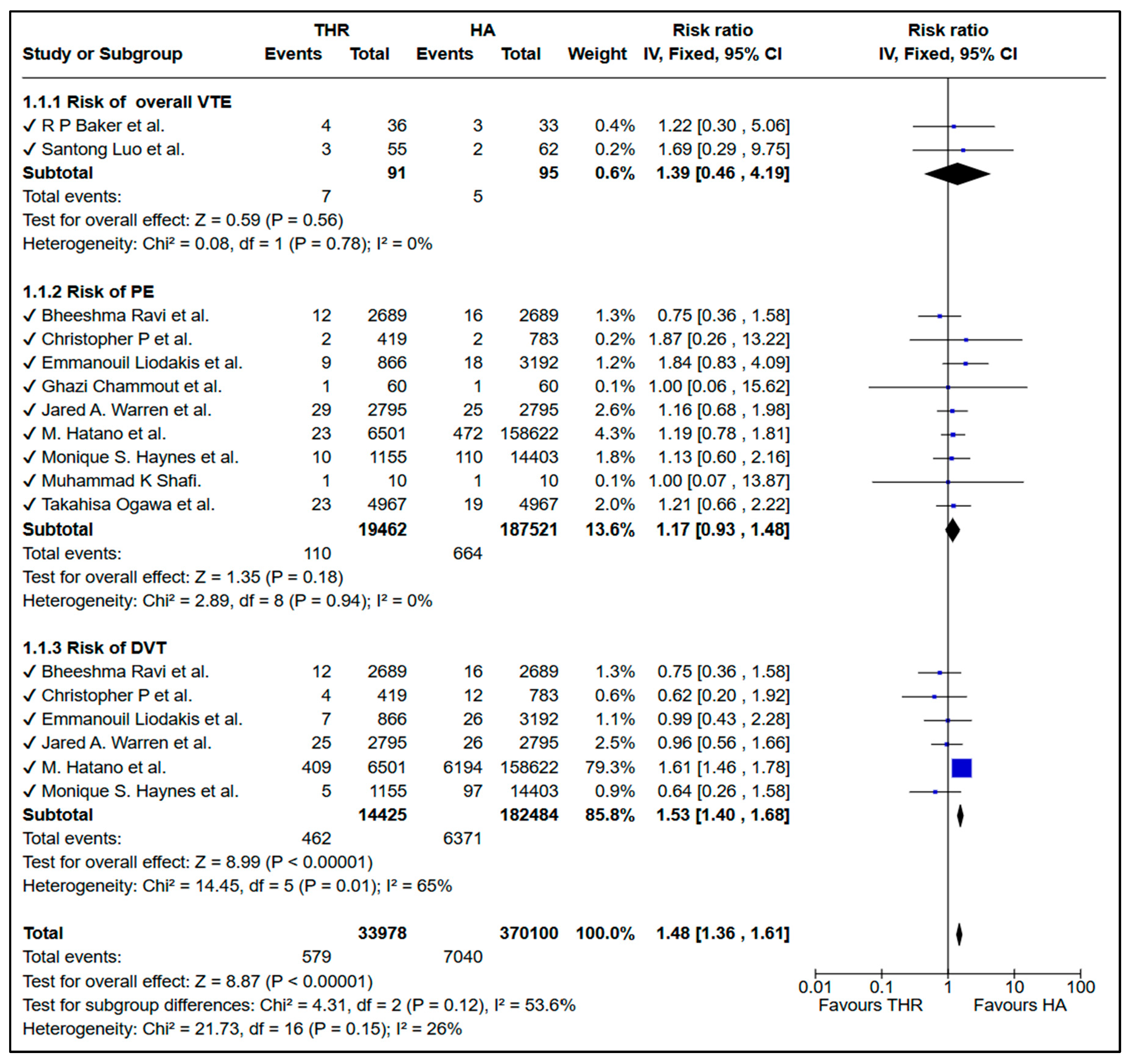 | Hatano et al. [19] (2024) | Retrospective cohort | (6501/158,622) | >60 years | Lower mortality in THR | Higher DVT in THR |