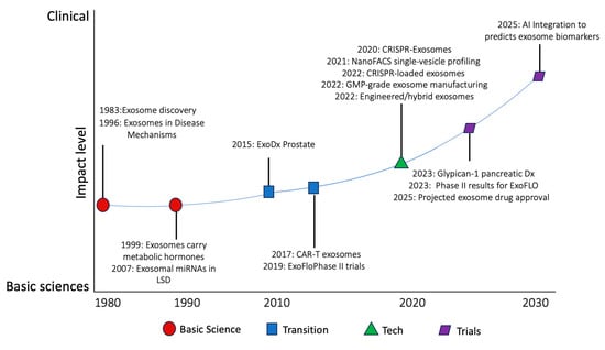 The major developments in exosome research and clinical development from 1980 to 2030, and the transition from basic science, illustrated by the horizontal axis, to clinical application, illustrated by the vertical axis.