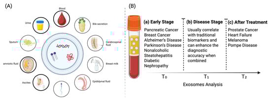 Tissue and liquid biopsies have long been a vital aspect of disease diagnosis and are often used to characterize the disease and provide a treatment guide [10]. Nevertheless, traditional tissue biopsy techniques encounter many distinct barriers. These are a result of their invasiveness, cost, time, and sampling bias caused by tissue heterogeneity [11,12,13]. A liquid biopsy has a low abundance of biomarkers in plasma during the early phases of the disease in conventional biomarkers. Serum-derived exosomes are particularly advantageous for non-invasive liquid biopsies, as they provide continuous monitoring of disease progression or response to treatment (Figure 2B) [14,15,16]. Exosomes are detectable in more than 15 biofluids, including blood, urine, saliva, bile, cerebrospinal fluid, breast milk, epididymal fluid, semen, ascites, amniotic fluid, and sputum, making them ideal for non-invasive liquid biopsies (Figure 2A) [17,18,19]. Exosomes mirror the physiological and pathological state of their parental cells, as they have the ability to influence the transfer of proteins, lipids, and nucleic acids [20,21,22]. These exosomes are protected from enzymatic degradation by a lipid bilayer membrane, which guarantees the integrity of their content [23]. The sensitivity of exosome detection has been significantly enhanced in recent years. This is because of the application of high-sensitivity technologies to the science of exosome detection [24,25,26,27]. These significant characteristics make exosomes next-generation biomarkers with the potential to change diagnostics, disease monitoring, and early intervention in clinical practice.