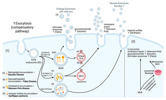 Several lysosomal storage diseases trigger a compensatory process in which the cell tries to evacuate accumulated substrates via exosomes. In Gaucher disease, glucosylceramide accumulation alters CD63/CD9 sorting. This accumulation leads to exosome hypersecretion and increased size heterogeneity [54,55,56]. Subsequently, during ILV formation, the endosome membrane undergoes a reorganization that results in a significant enrichment of selected proteins such as tetraspanins. This is an important process disrupted in Niemann–Pick Type C disease, where ceramide metabolism defects impair tetraspanin microdomain organization [57]. This prevents the sorting of cholesterol into ILVs for storage or exosomal release, resulting in in lysosomal cholesterol accumulation and compensatory exosome hypersecretion [58,59]. The same compensatory mechanisms occur in Fabry disease and Sanfilippo syndrome (Figure 3).