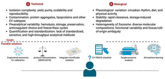 Key technical (A) and biological (B) challenges encountered in exosome studies, along with corresponding “possible solutions” depicted below each panel.