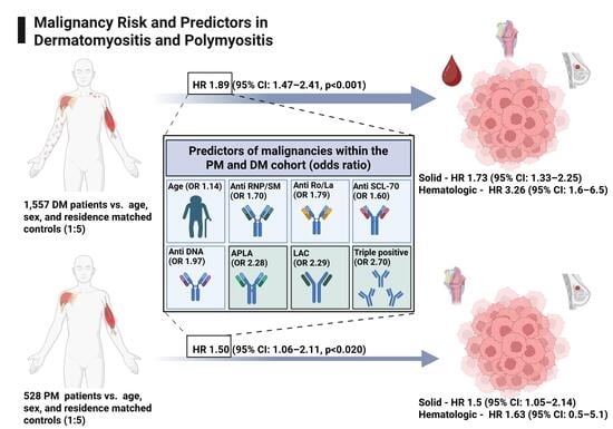 Patt, Y.S.; Ben-Shabat, N.; David, P.; Patt, C.; Sharif, K.; Elizur, Y.; Cohen, I.; Cohen, A.D.; Amital, H.; Watad, A.; et al. Malignancy Risk and Predictors in Dermatomyositis and Polymyositis: A Large Population-Based Study. Medicina 2025, 61, 1932. https://doi.org/10.3390/medicina61111932