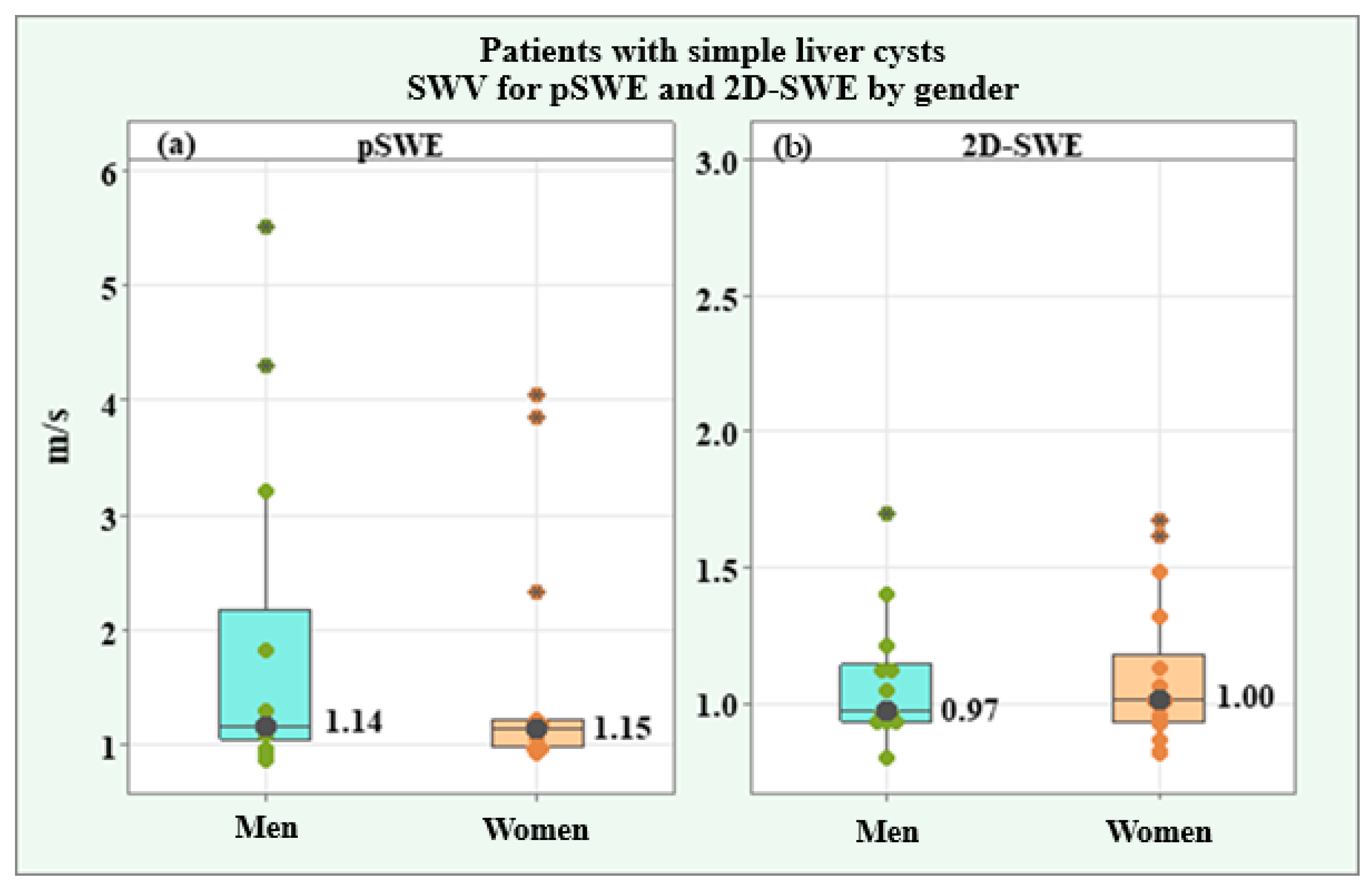 - No significant difference was found between the two genders regarding the SWV values for pSWE and 2D-SWE in patients with simple liver cysts.