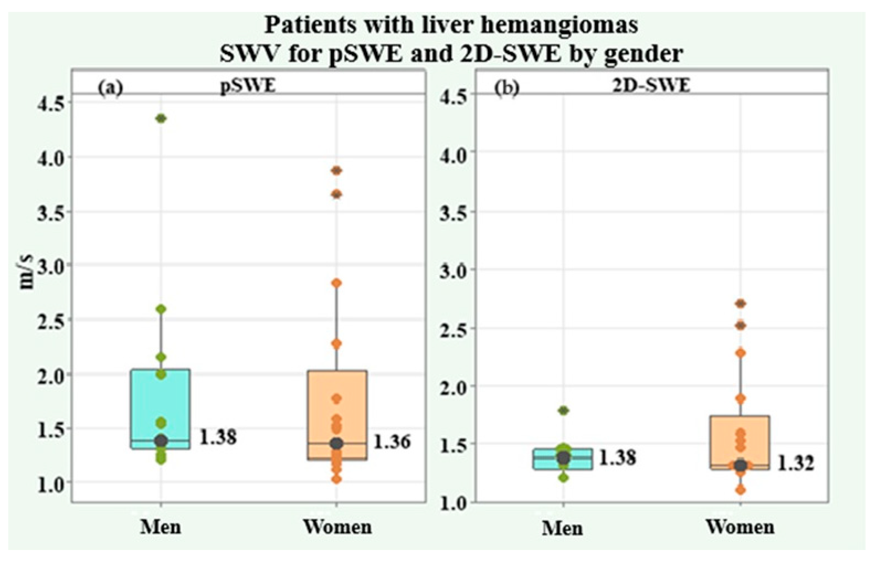 - No significant difference was found between the two genders regarding SWV values for pSWE and 2D-SWE in patients with liver hemangiomas.