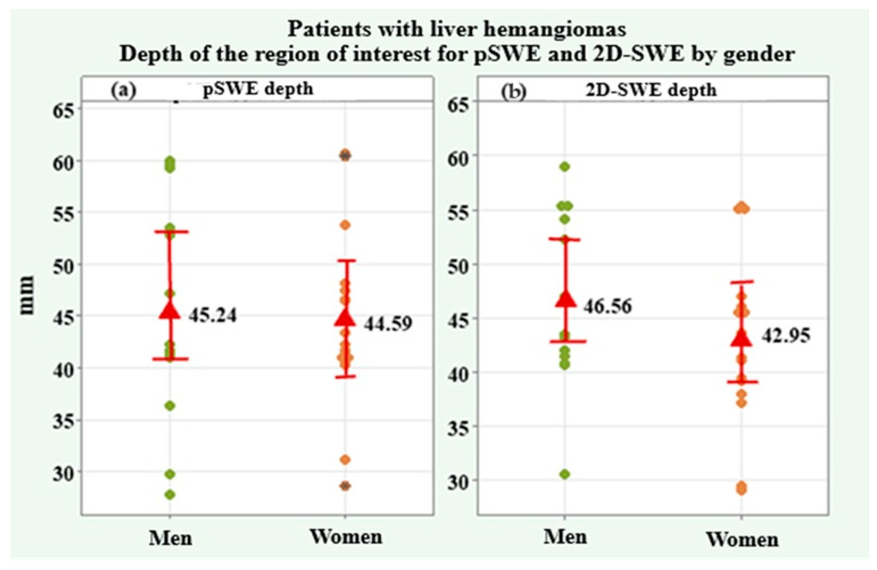 4.2.2. SWV and Depth of the Region of Interest Values for pSWE and 2D-SWE in Patients with Liver Hemangiomas