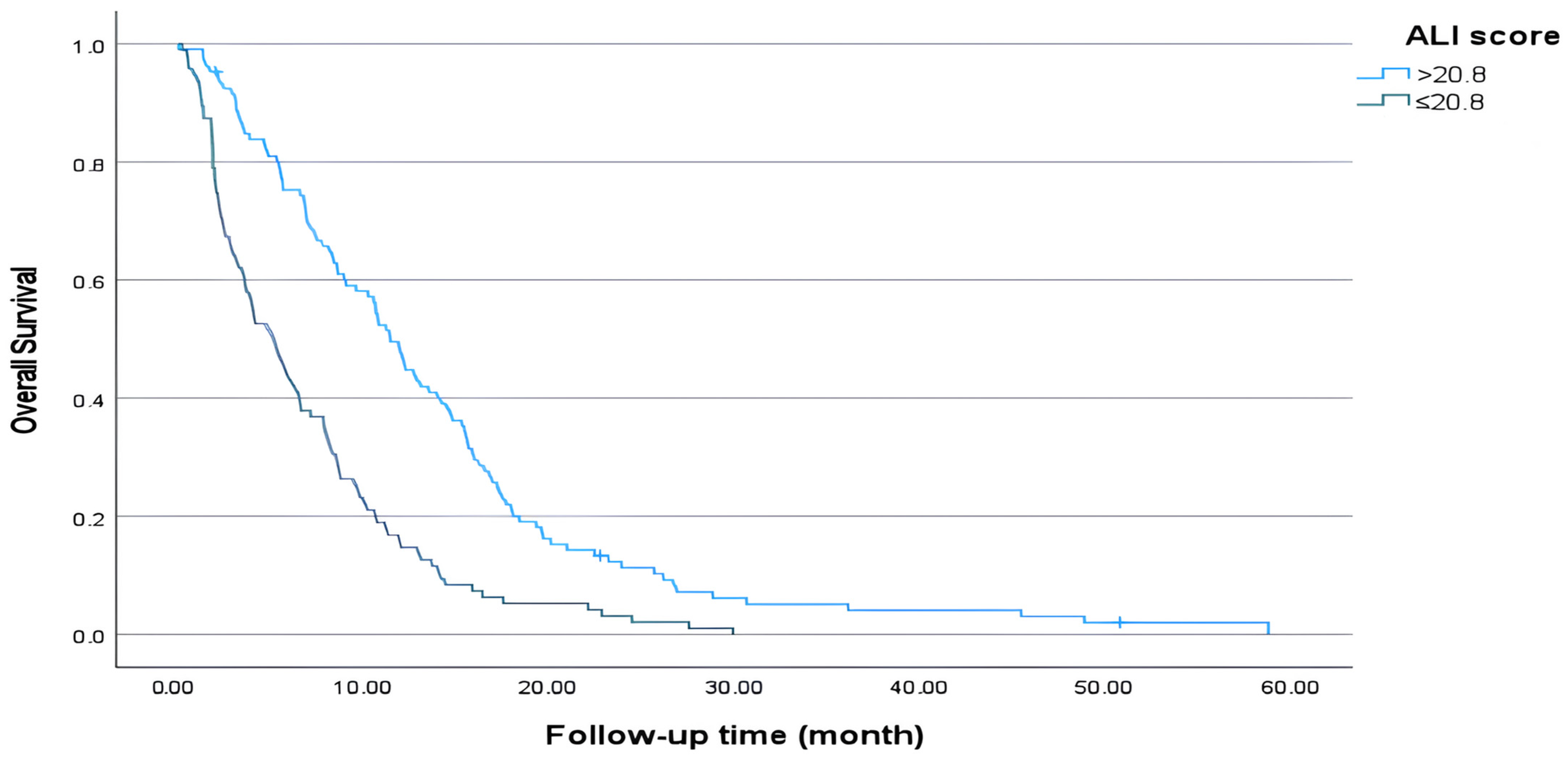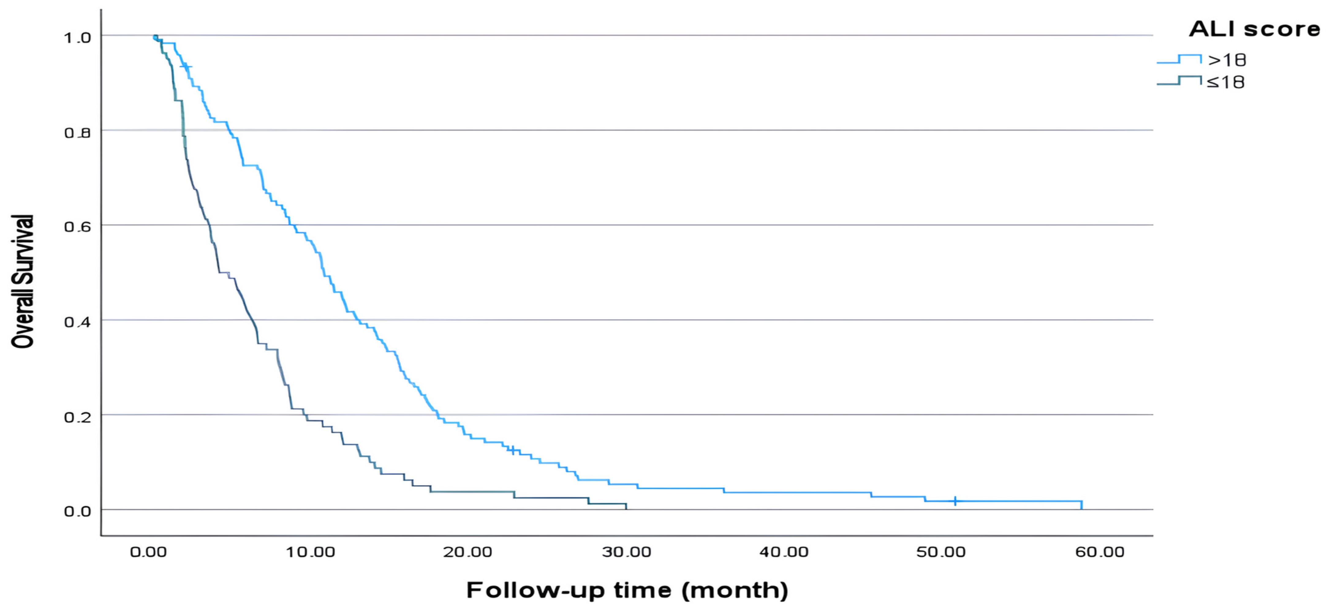 - Laboratory Parameters (at Baseline): Serum albumin level (g/dL), absolute neutrophil count (×103/µL), and absolute lymphocyte count (×103/µL). The NLR was calculated as the absolute neutrophil count divided by the absolute lymphocyte count. BMI was calculated by dividing the patient’s weight in kilograms at the start of treatment by their height in metres squared. The ALI was calculated as BMI at the start of treatment × serum albumin (g/dL)/NLR.