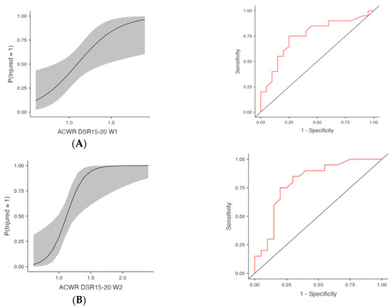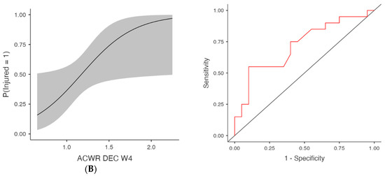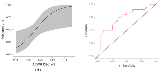 Initially, significant models were identified for multiple ACWR variables (Table 1 and Table 2, Figure 1, Figure 2, Figure 3 and Figure 4). ACWR DSR15–20 showed strong predictive power across all four weeks (Table 1 and Figure 1). At W3, the model yielded χ2(1) = 14.50, p < 0.001, R2McF = 0.262, R2N = 0.406 and an AUC of 0.811 (95% CI [0.675, 0.947]), indicating excellent discriminative ability.
