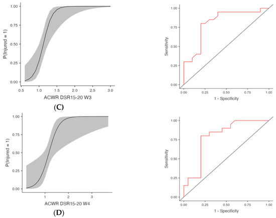 Injury Risk Probability and ROC Curves for Weekly ACWR DSR15-20. Note: (Left) panels display the estimated probabilities of injury (Injured = Yes) as a function of acute:chronic workload ratios (ACWRs), with 95% confidence intervals (shaded area). (Right) panels show the ROC curves corresponding to each predictor, assessing the discriminative ability of the logistic regression models. The red lines represent the sensitivity–specificity trade-off across probability thresholds, with the area under the curve (AUC) quantifying model performance. (A) Week 1 (W1): Probability of injury and ROC curve based on ACWR DSR15-20 values from the first week preceding injury occurrence. (B) Week 2 (W2): Probability of injury and ROC curve based on ACWR DSR15-20 values from the second week preceding injury occurrence. (C) Week 3 (W3): Probability of injury and ROC curve based on ACWR DSR15-20 values from the third week preceding injury occurrence. (D) Week 4 (W4): Probability of injury and ROC curve based on ACWR DSR15-20 values from the fourth week preceding injury occurrence.