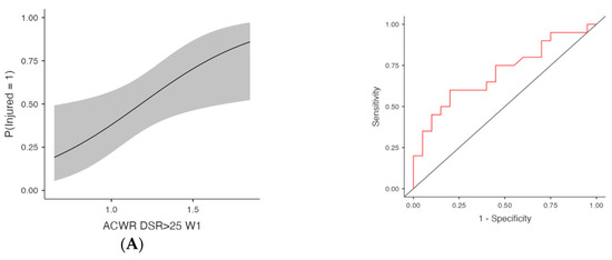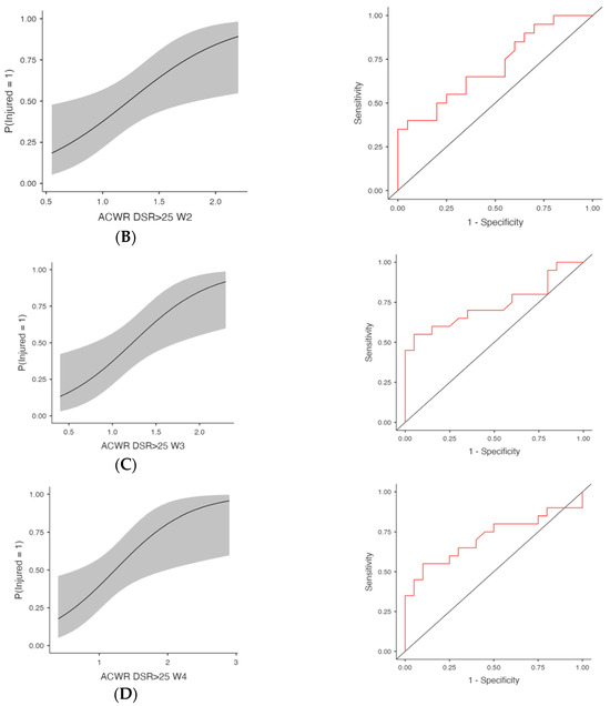 Injury Risk Probability and ROC Curves for Weekly ACWR DSR>25. Note: (Left) panels display the estimated probabilities of injury (Injured = Yes) as a function of acute:chronic workload ratios (ACWRs), with 95% confidence intervals (shaded area). (Right) panels show the ROC curves corresponding to each predictor, assessing the discriminative ability of the logistic regression models. The red lines represent the sensitivity–specificity trade-off across probability thresholds, with the area under the curve (AUC) quantifying model performance. (A) Week 1 (W1): Probability of injury and ROC curve for the ACWR of sprinting distance (>25 km/h) recorded during the first week preceding injury occurrence. (B) Week 2 (W2): Probability of injury and ROC curve for the ACWR of sprinting distance (>25 km/h) recorded during the second week preceding injury occurrence. (C) Week 3 (W3): Probability of injury and ROC curve for the ACWR of sprinting distance (>25 km/h) recorded during the third week preceding injury occurrence. (D) Week 4 (W4): Probability of injury and ROC curve for the ACWR of sprinting distance (>25 km/h) recorded during the fourth week preceding injury occurrence.