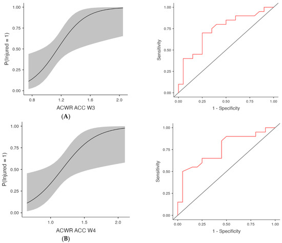 Injury Risk Probability and ROC Curves for Weekly ACWR- Acceleration metrics. Note: (Left) panels display the estimated probabilities of injury (Injured = Yes) as a function of acute:chronic workload ratios (ACWRs), with 95% confidence intervals (shaded area). (Right) panels show the ROC curves corresponding to each predictor, assessing the discriminative ability of the logistic regression models. The red lines represent the sensitivity–specificity trade-off across probability thresholds, with the area under the curve (AUC) quantifying model performance. (A) Week 3 (W3): Probability of injury and ROC curve for the ACWR of acceleration events recorded during the third week preceding injury occurrence. (B) Week 4 (W4): Probability of injury and ROC curve for the ACWR of acceleration events recorded during the fourth week preceding injury occurrence.