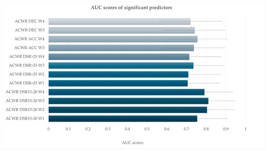 Area under the curve (AUC) values with 95% confidence intervals for acute:chronic workload ratio (ACWR) variables significantly associated with injury risk. All predictors listed demonstrated statistical significance (p < 0.05) in the logistic regression models.