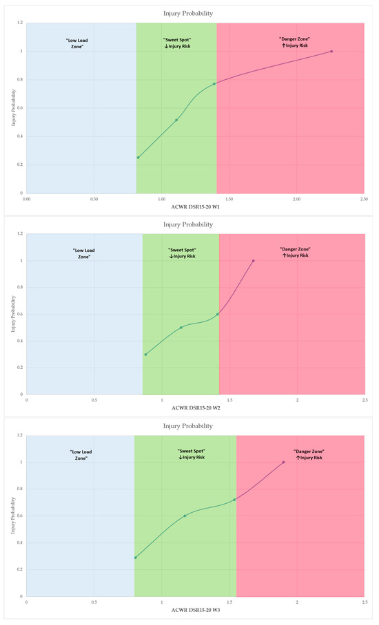 Deceleration metrics (ACWR DEC) followed a comparable trend. At W3, the Sweet Spot spanned 0.944–1.394, while at W4, it ranged from 0.896 to 1.481. Exceeding the upper bounds of these ranges was consistently associated with a marked rise in injury probability. Coaching staff may utilize the identified “sweet spot” zones to guide weekly load adjustments, aiming to maintain athletes within optimal ranges that minimize injury risk while still promoting sufficient physical adaptation. Conversely, the detection of “danger zone” values may prompt preventive load reduction, individualized recovery protocols, or alternative training prescriptions for at-risk athletes, particularly in the two-to-four weeks preceding competitive or important matches. By adopting a probabilistic injury risk model, these findings could contribute to the development of evidence-based load management strategies aimed at reducing injury incidence, optimizing training periodization, and supporting long-term athlete health and performance. These results may serve as a foundation for further research and intervention development in the field of sports science and injury prevention, potentially enhanced through the implementation of artificial intelligence (AI)-based models, including machine learning algorithms and predictive analytics. Such approaches could further improve the precision of injury risk estimation by integrating multivariate workload indicators, individual athlete profiles, and contextual factors, thereby supporting more accurate and personalized load management strategies. The use of the limits presented in the study with specific reference values will be able to enhance their usefulness for injury prevention practices as well as for monitoring training loads with regard to maximizing athletic performance. The study encourages the use of these results between different leagues or age groups, which will probably contribute to the validation of the specific limits in order to support their application in practice, through scientific documentation.