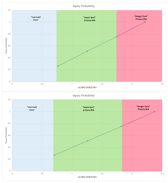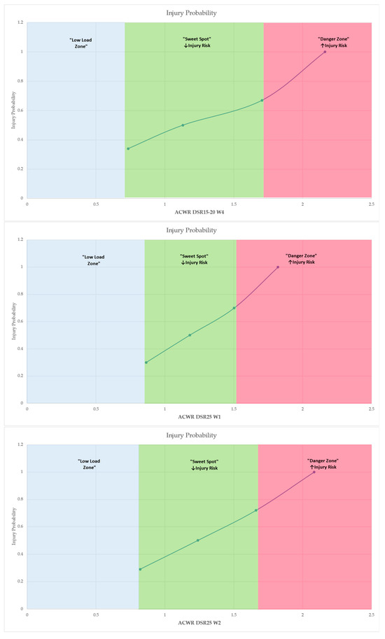 Specifically, for each ACWR predictor, the mean and standard deviation (SD) were computed, and three representative values were selected: the mean, mean −1 SD and mean +1 SD. These three values (mean ±1 SD and mean) were used to generate predicted probabilities of injury at defined points along the workload. The Low Load Zone was defined as the range of ACWR values below the lower threshold (mean –1 SD), where training stimulus was minimal. The Sweet Spot Zone corresponded to the interval between −1 SD and +1 SD, where injury probability remained moderate or controlled. In contrast, the Danger Zone was identified as the range exceeding +1 SD, where injury probability increased, indicating potential overload. Then, these zones were visualized in Excel using line charts overlaid with colored sections to represent their boundaries, in line with the theoretical framework for the Sweet Spot and Danger Zone proposed by Gabbett [19].