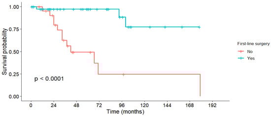 A multivariable Cox proportional hazards analysis including first-line surgery, tumor grade, and disease stage was performed. In this adjusted model, surgical resection remained strongly associated with improved OS (HR = 0.05, 95% CI 0.008–0.34, p = 0.002). Higher tumor grade was independently associated with increased risk of death (HR = 7.78, 95% CI 1.28–47.4, p = 0.026), whereas disease stage was not significantly related to survival in our analysis (HR = 1.02, 95% CI 0.54–1.96, p = 0.94).