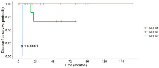 DFS for patients who underwent R0 resection (N = 33) was 95.8% at one year and 84.3% at three and five years, with no median DFS reached. Tumor grade was the only significant predictor: all G1 patients remained disease-free throughout follow-up, whereas one-third of G2 patients experienced recurrence within 5 years (p < 0.001, Figure 3). Tumor size, nodal status, and metastatic disease had no significant effect on DFS (Table 7).
