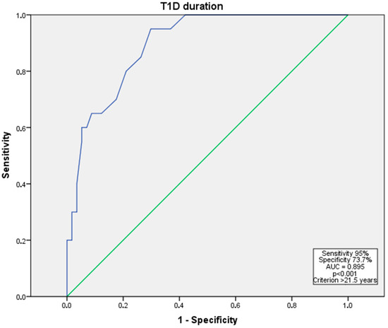 With a DM duration more than 21.5 years, the T1D subgroup patients had 5.4 times higher odds of having advanced DR (severe NPDR to PDR); the discriminative ability of the model was evaluated using the ROC test (95% sensitivity and 73.7% specificity, area under the curve (AUC) = 0.895, p < 0.001) (Figure 1).