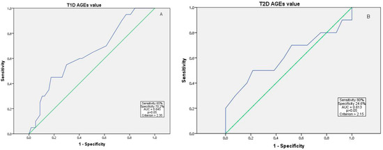 ROC curve for advanced DR (severe NPDR to PDR) risk in relation to AGE value in T1D (A) and T2D (B). Abbreviations: AGEs—advanced glycation end products; AUC—area under the curve; NPDR—non-proliferative diabetic retinopathy; PDR—proliferative diabetic retinopathy; ROC—receiver operating characteristic; T1D—type 1 diabetes mellitus; T2D—type 2 diabetes mellitus. The blue line indicates the ROC curve, and the green diagonal line represents the reference line.