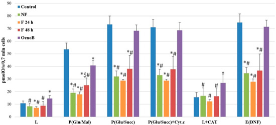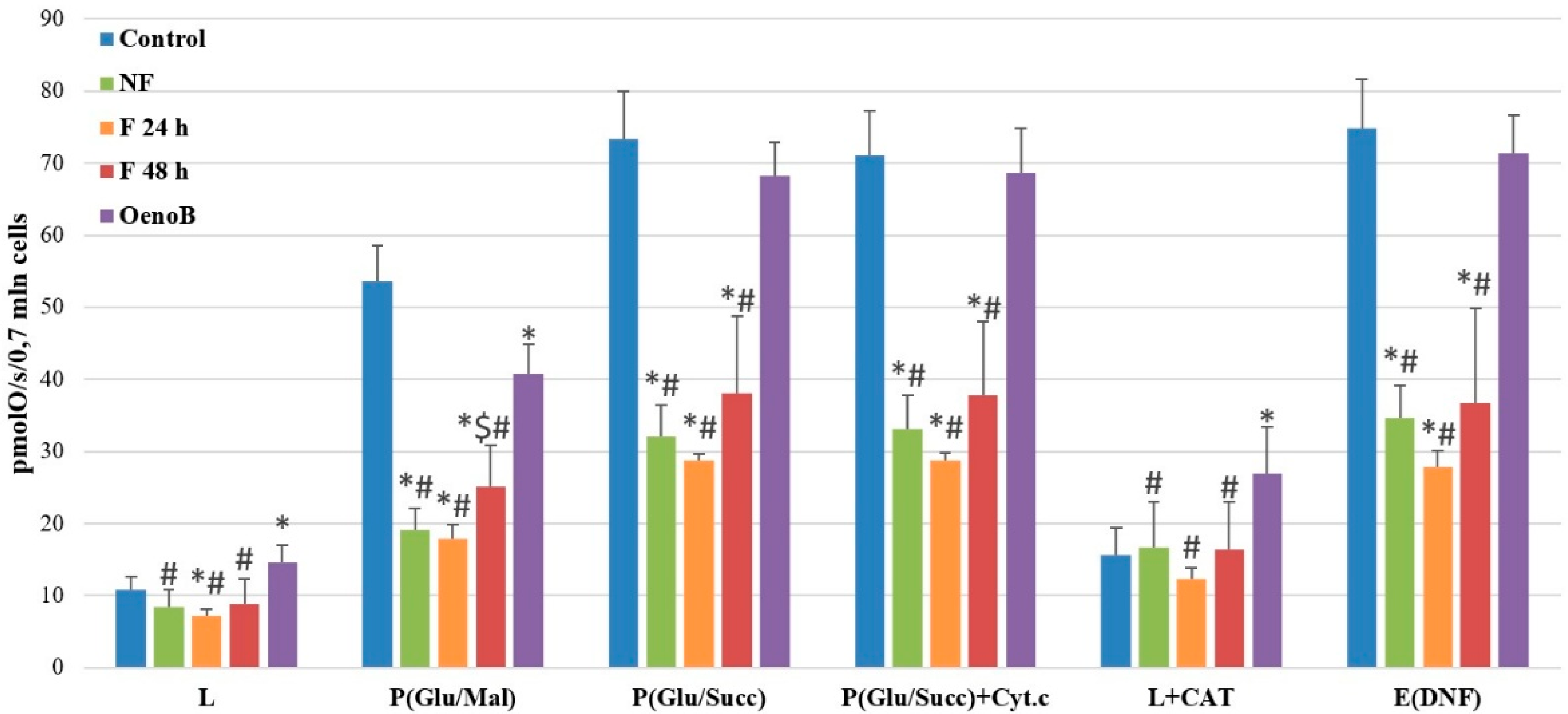 Figure 5. Fireweed leaf aqueous extract and oenothein B effect on Caco-2 cell mitochondrial function. NF—cells treated with unfermented fireweed leaf extract; F 24 h—cells treated with extract made from fireweed leaves fermented for 24 h; F 48 h—cells treated with extract made from fireweed leaves fermented for 48 h; OenoB—cells treated with oenothein B. L—proton leak state with mitochondrial Complex 1 substrates (glutamate/malate); P(Glu/Mal)—oxidative phosphorylation with mitochondrial Complex 1 substrates (glutamate/malate) after adding ADP; P(Glu/Succ)—oxidative phosphorylation with mitochondrial Complex I (glutamate/malate) and Complex 2 (succinate) substrates; P(Glu/Succ + Cyt.c)—oxidative phosphorylation with cytochrome c; L + CAT—proton leak state with the inhibitor adenine nucleotide carrier carboxyatractyloside (CAT); E(DNP)—electron transport state with the uncoupler dinitrophenol (DNP). n ≥ 3, MEAN ± SD; * p < 0.05 compared to control; $ p < 0.05 compared to F 24 h group; # p < 0.05 compared to oenothein B.