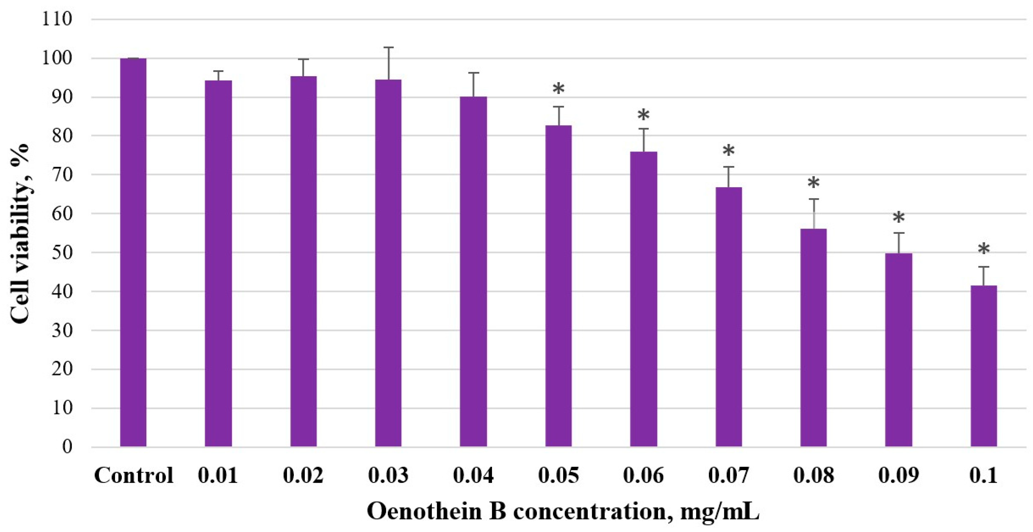 Figure 4. Effect of oenothein B on Caco-2 cell viability. Cell viability analysis by MTT assay. Cell viability (%) depending on oenothein B concentration (mg/mL) after 48 h treatment. n = 4, MEAN ± SD; * p < 0.05 compared to control.