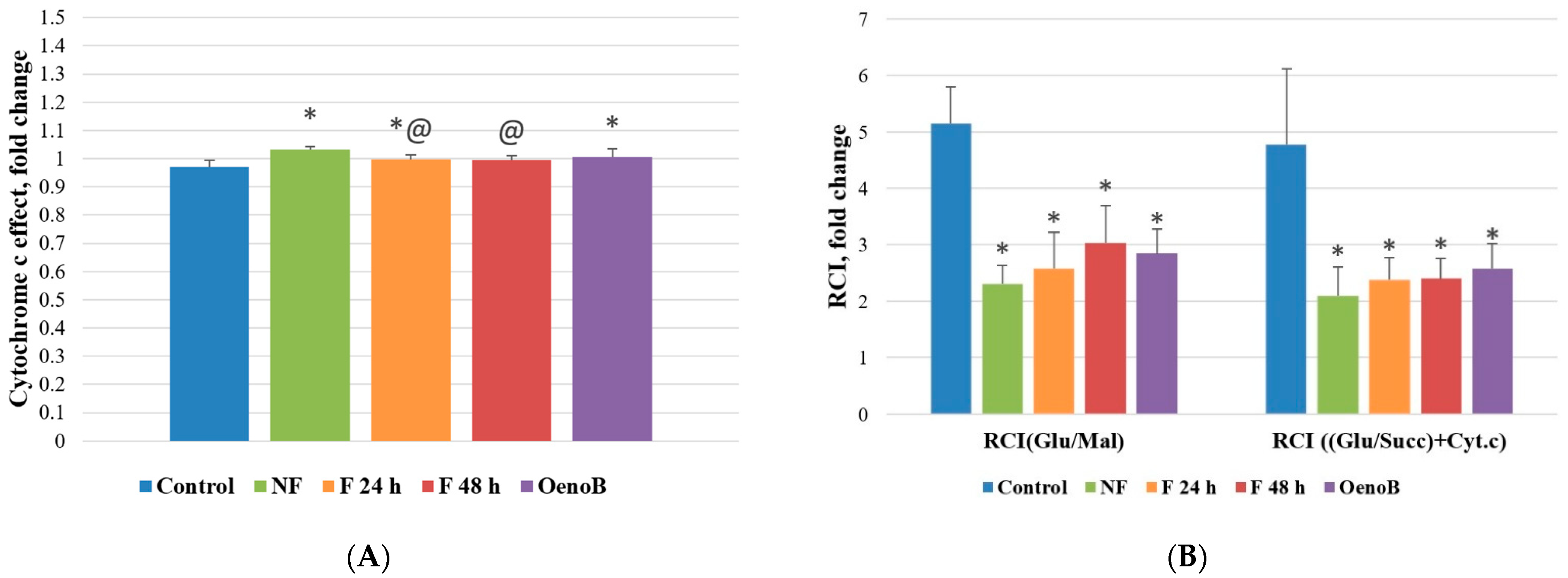 Figure 6. Fireweed leaf aqueous extract and oenothein B effect on Caco-2 cell cytochrome c effect (A) and respiratory control index (B). NF—cells treated with unfermented fireweed leaf extract; F 24 h—cells treated with extract made from fireweed leaves fermented for 24 h; F 48 h—cells treated with extract made from fireweed leaves fermented for 48 h; OenoB—cells treated with oenothein B. RCI(Glu/Mal)—respiratory control index in the presence of Complex 1 substrates (glutamate/malate); RCI((Glu/Succ) + Cyt.c))—respiratory control index in the presence of Complex 2 substrate (succinate). n = 3, MEAN ± SD; * p < 0.05 compared to control; @ p < 0.05 compared to NF.