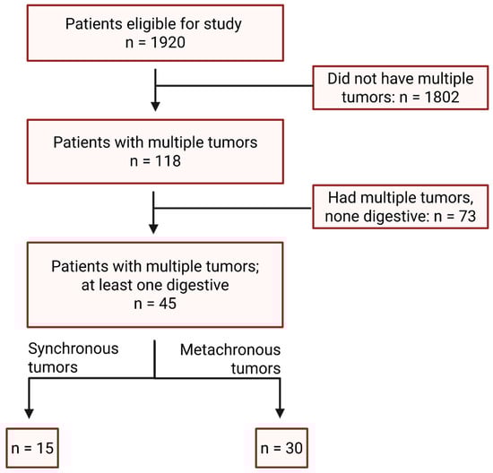 Between January 2020 and June 2023, 1920 patients with oncological diagnoses were admitted to the oncology and radiotherapy services; 118 (6.14%) had synchronous and/or metachronous MPMTs. Of these, 45 patients (38.1% of the MPMT cohort; 2.34% of all oncologic admissions) met inclusion criteria by having at least one tumor of digestive origin and a diagnosis established during the study window.