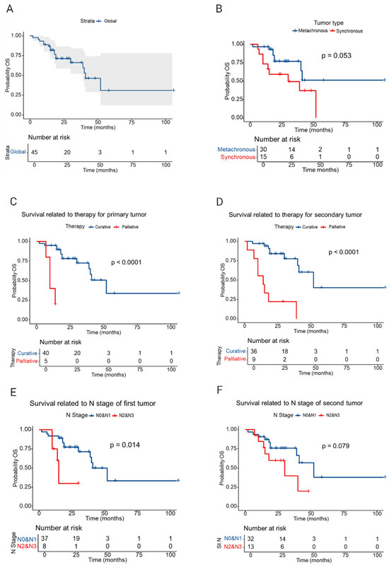 In summary, synchronous presentation was associated with inferior unadjusted survival, but nodal stage and the feasibility of curative therapy were the most decisive predictors of outcome. Given the small sample size and retrospective design, our findings are associative and should be considered preliminary. They support the need for dedicated prospective registries and molecular characterization to validate prognostic markers and refine surveillance strategies for patients at risk of multiple primaries.