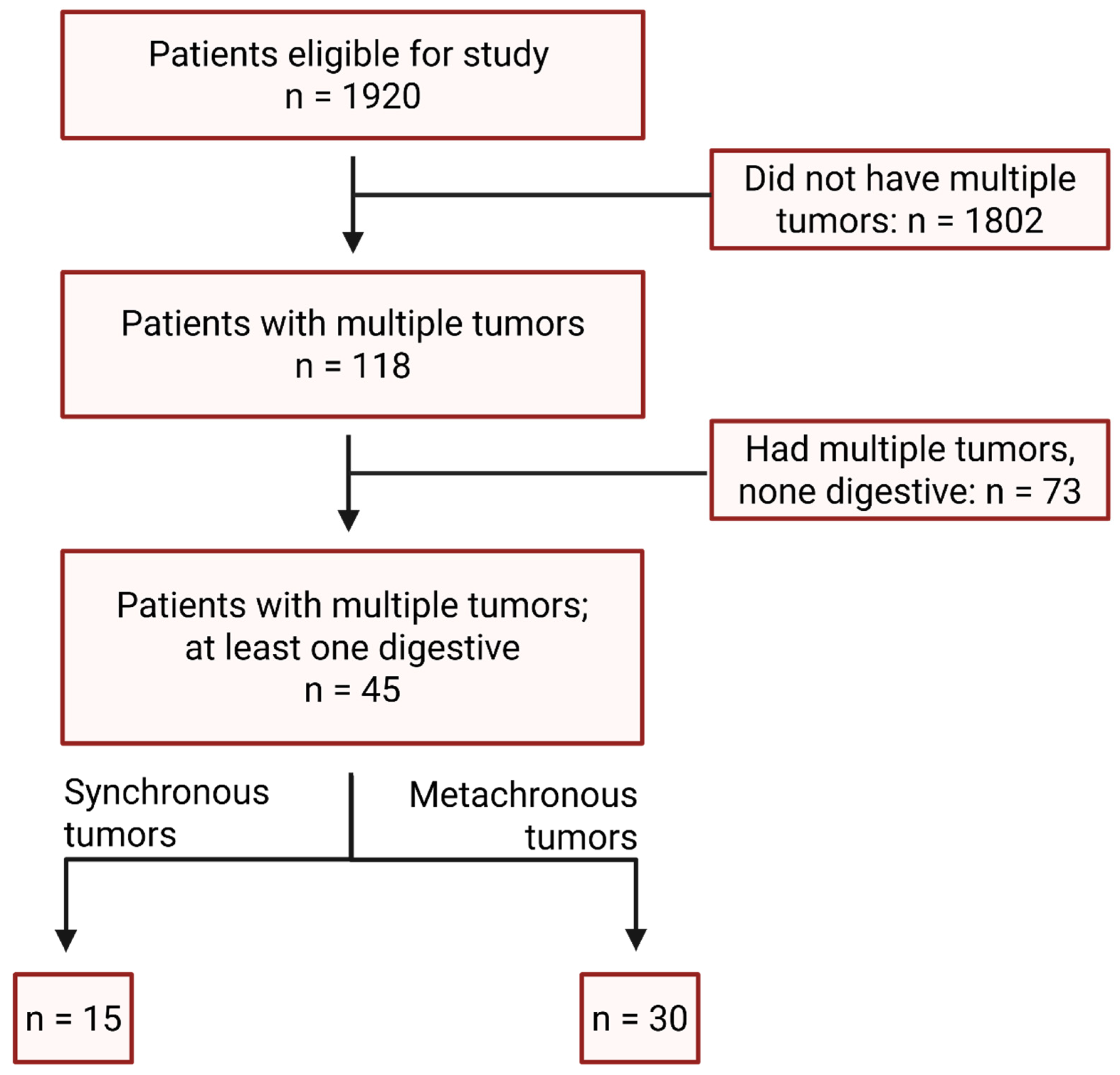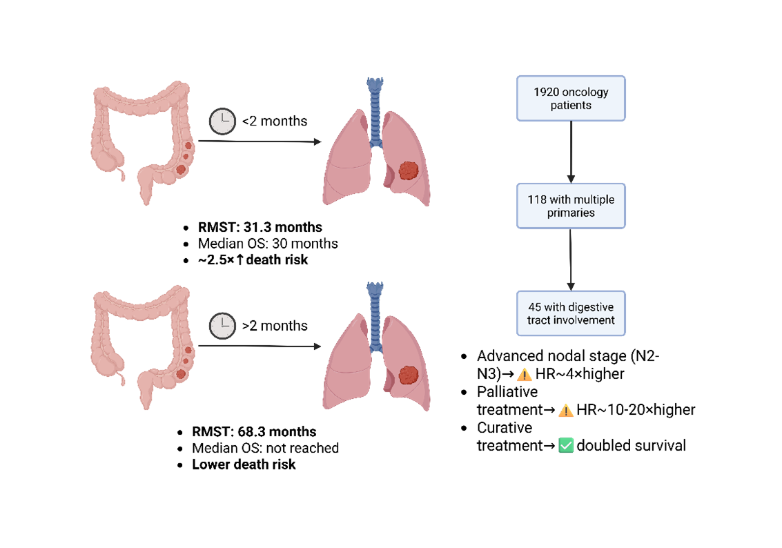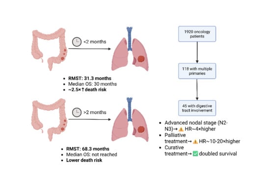 Oprita, A.V.; Nitipir, C.; Achim, E.; Grama, F.A. Synchronous Versus Metachronous Multiple Malignant Tumors Involving the Digestive Tract: Predictors of Survival from a Single-Center Retrospective Study. Medicina 2025, 61, 1962. https://doi.org/10.3390/medicina61111962