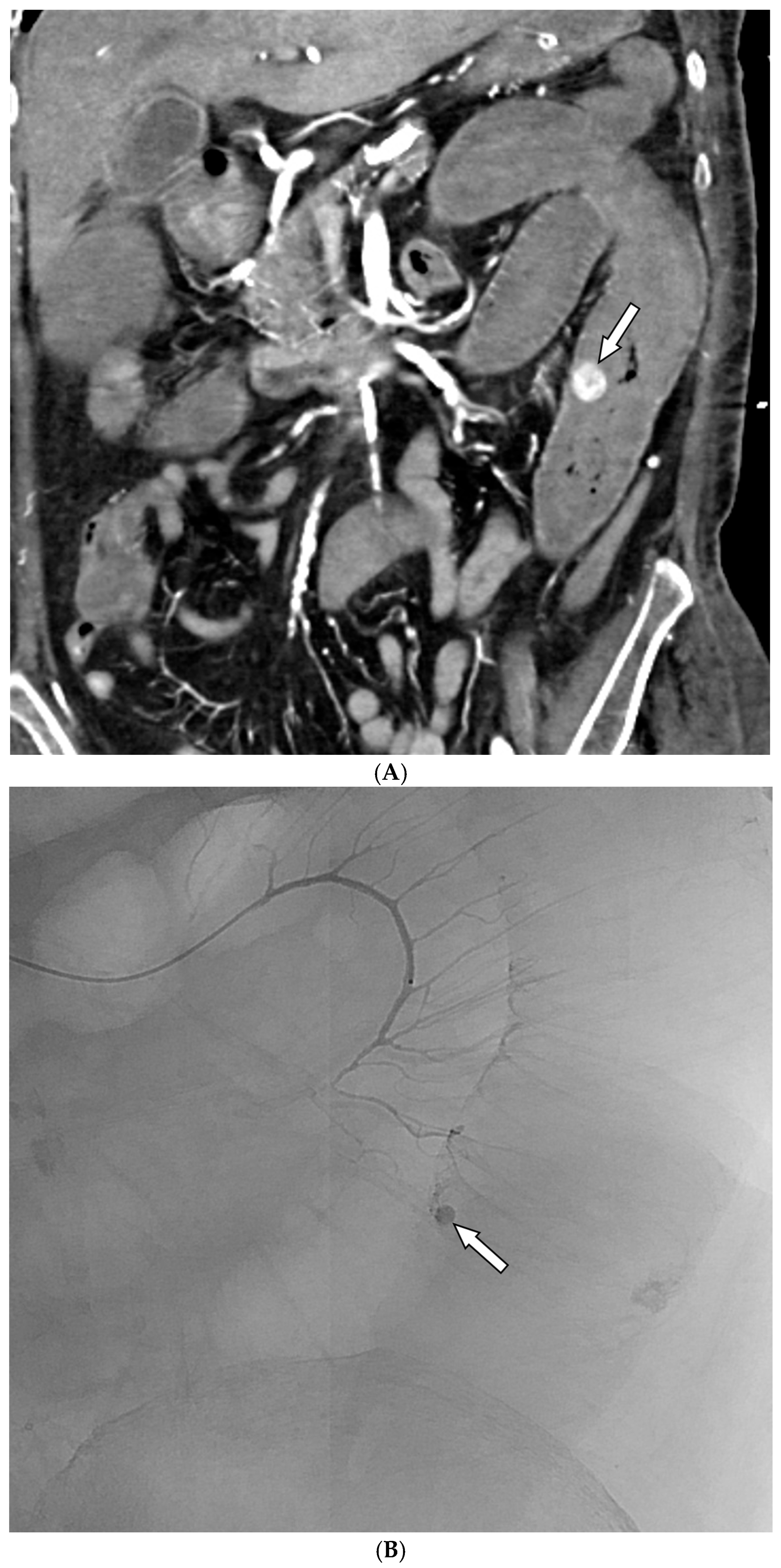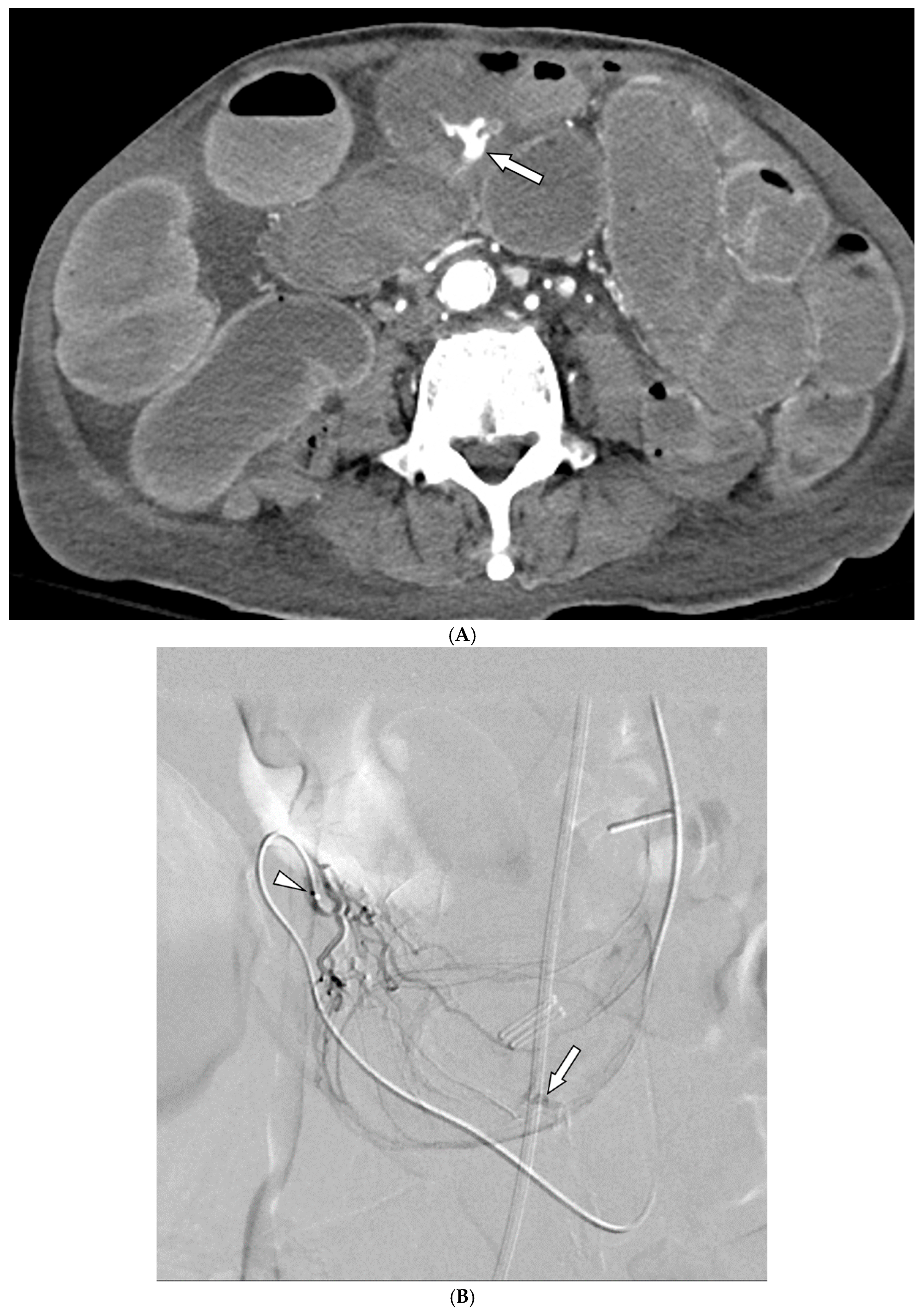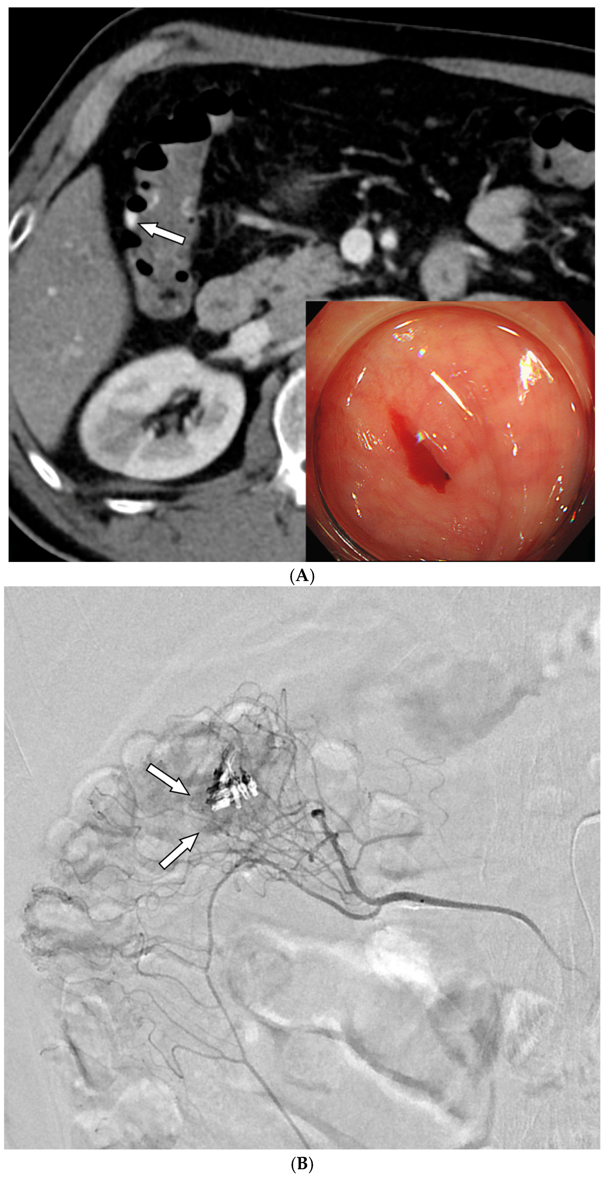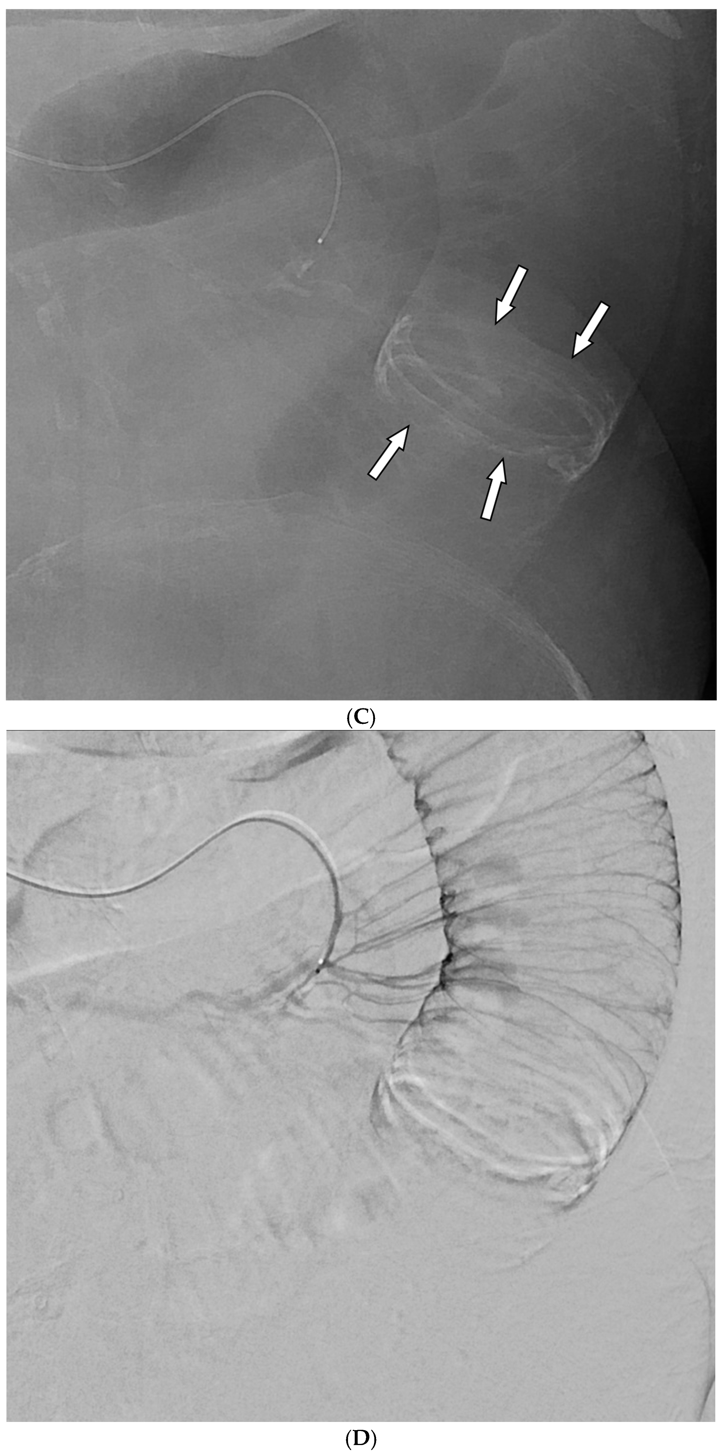 - Loffroy, R.; Rao, P.; Ota, S.; Lin, M.D.; Kwak, B.-K.; Geschwind, J.-F. Embolization of Acute Nonvariceal Upper Gastrointestinal Hemorrhage Resistant to Endoscopic Treatment: Results and Predictors of Recurrent Bleeding. Cardiovasc. Interv. Radiol. 2010, 33, 1088–1100. [Google Scholar] [CrossRef]
