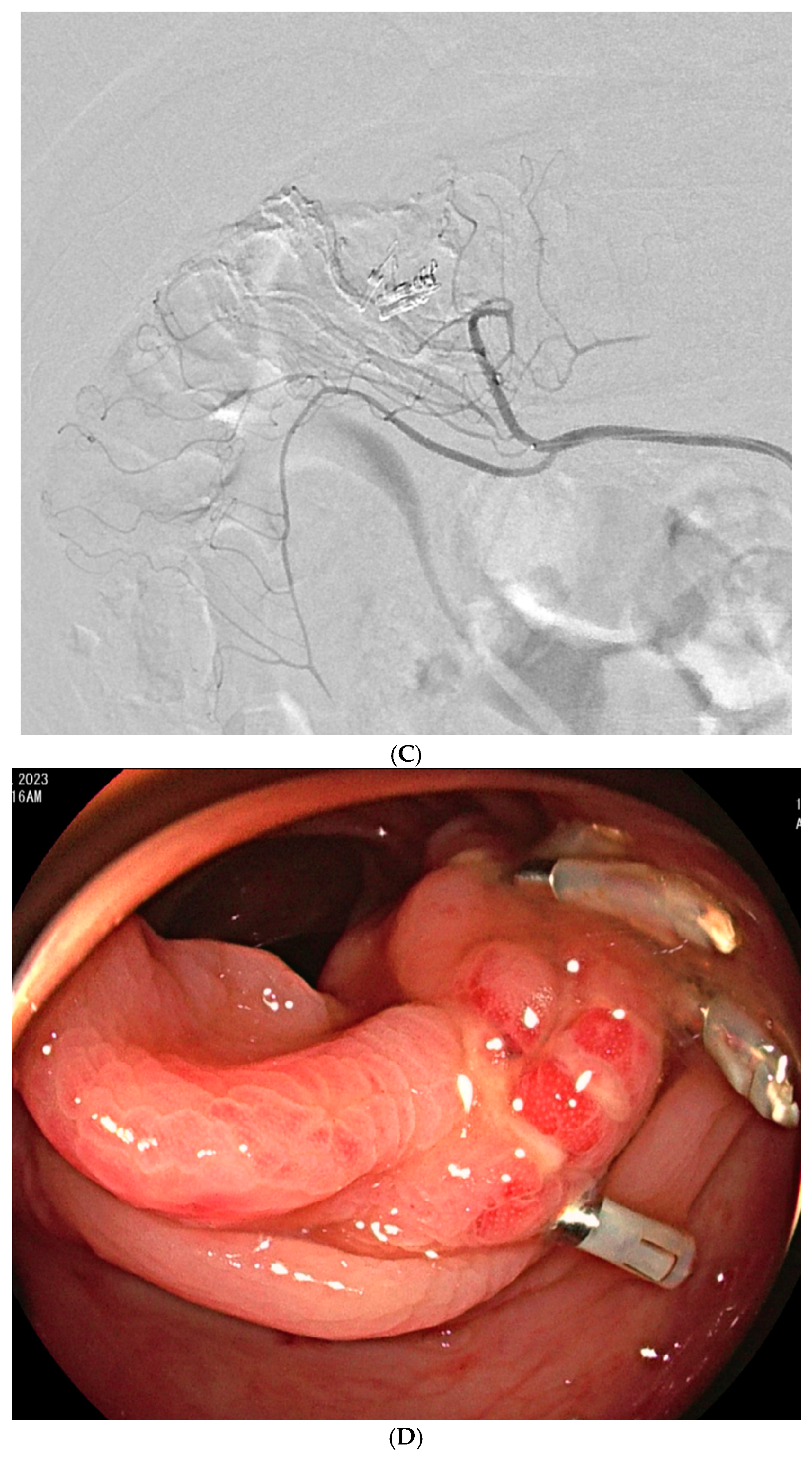 - Koganemaru, M.; Abe, T.; Iwamoto, R.; Kusumoto, M.; Suenaga, M.; Saga, T.; Hayabuchi, N. Ultraselective arterial embolization of vasa recta using 1.7-French microcatheter with small-sized detachable coils in acute colonic hemorrhage after failed endoscopic treatment. AJR Am J Roentgenol 2012, 198, W370–W372. [Google Scholar] [CrossRef] [PubMed]