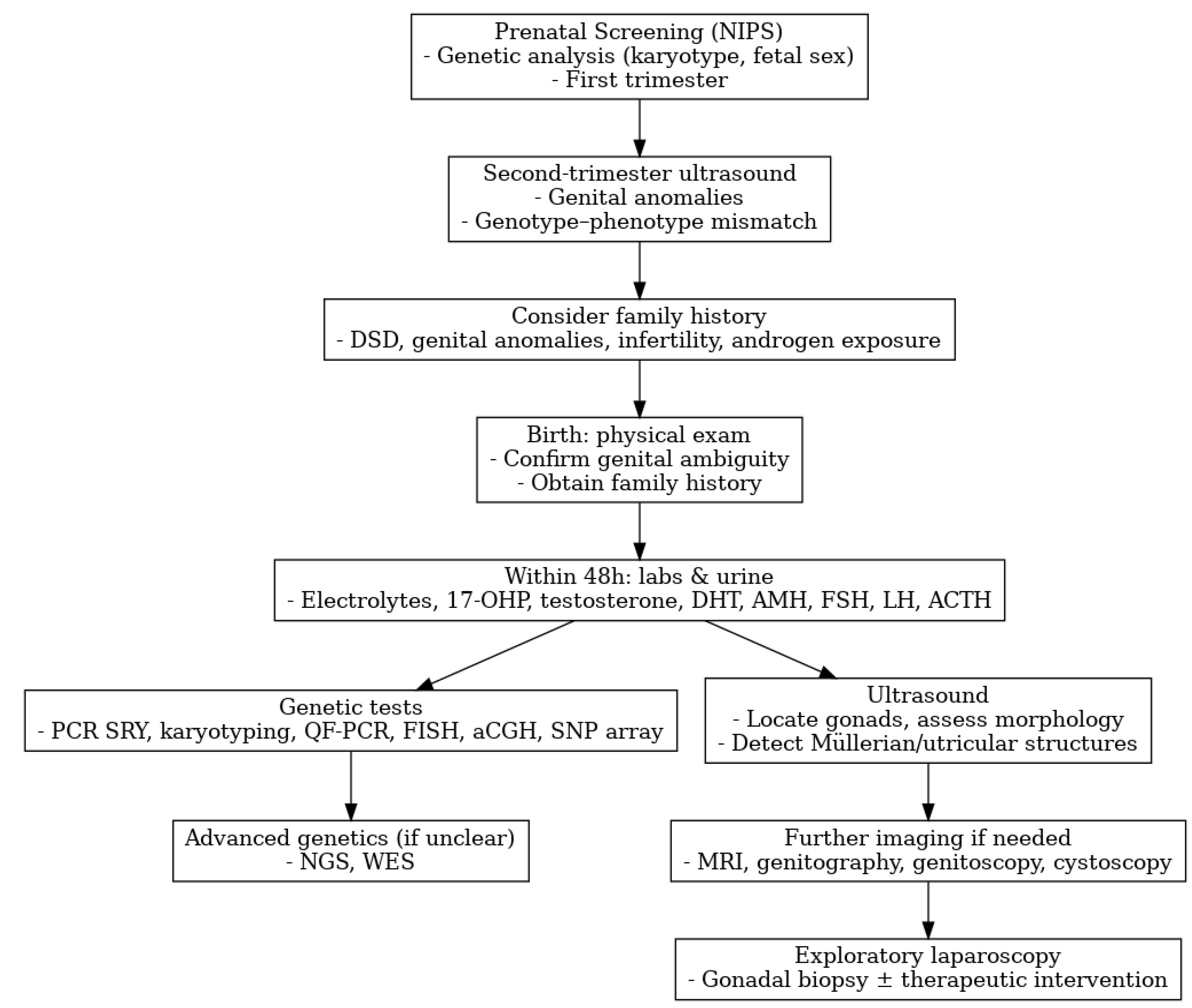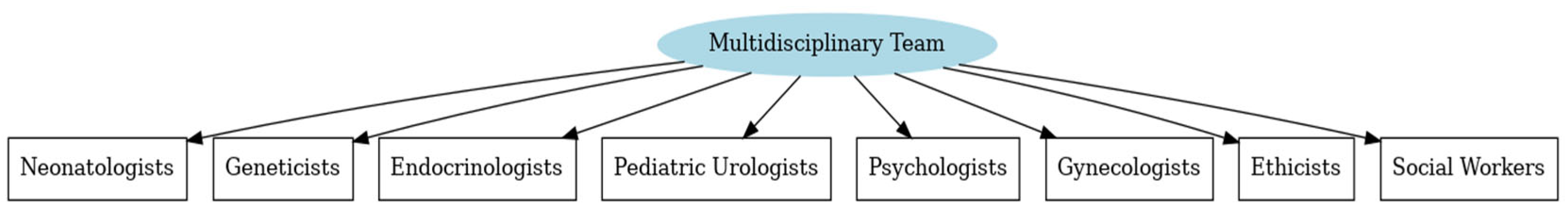 - Weidler, E.M.; Ochoa, B.; van Leeuwen, K. Prenatal and postnatal evaluation of differences of sex development: A user’s guide for clinicians and families. Curr. Opin. Pediatr. 2024, 36, 547–553. [Google Scholar] [CrossRef]