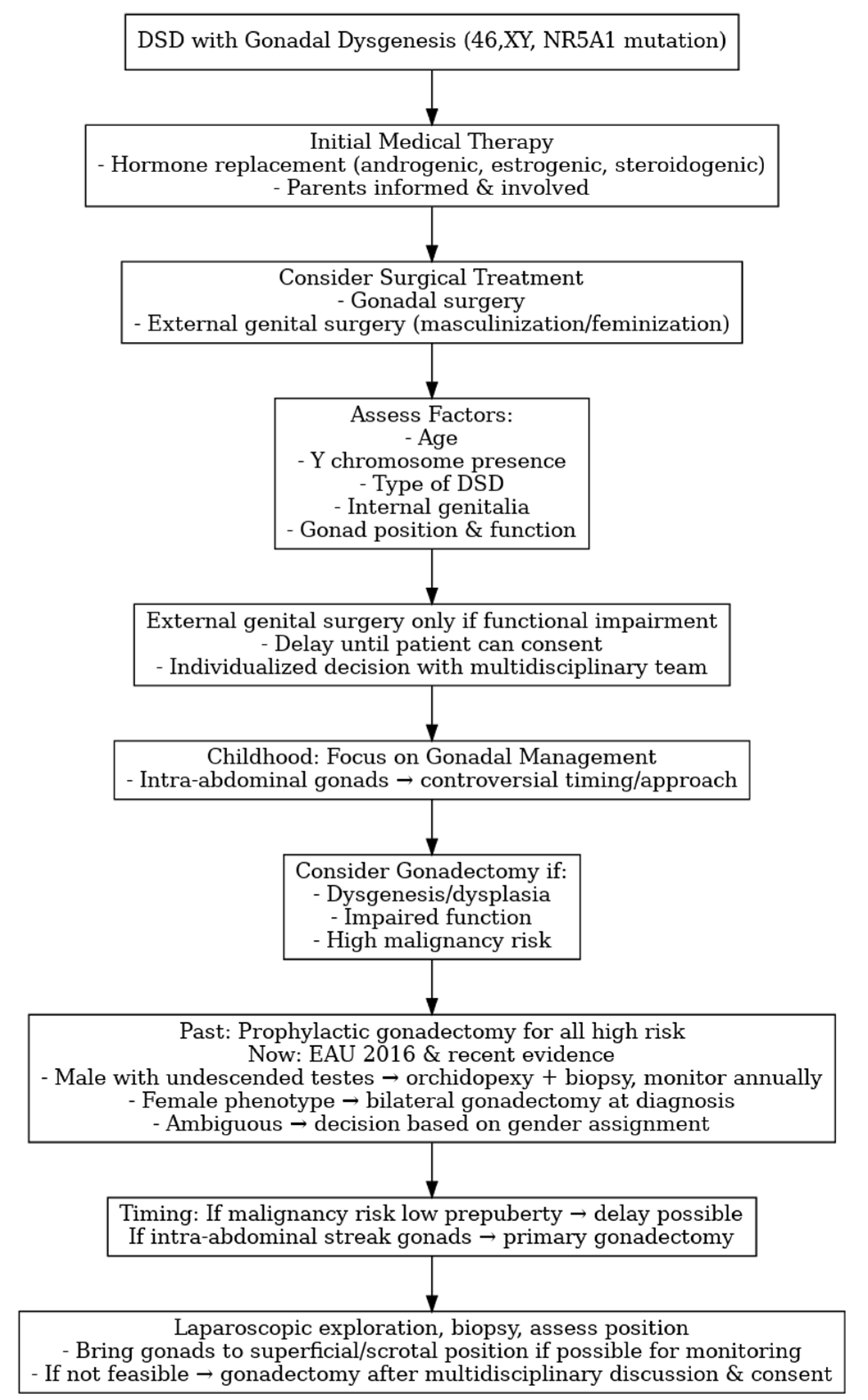- First-tier genetics: Order a NGS DSD multigene panel that includes NR5A1. Trio-based testing (patient and parents) is preferred to clarify inheritance.